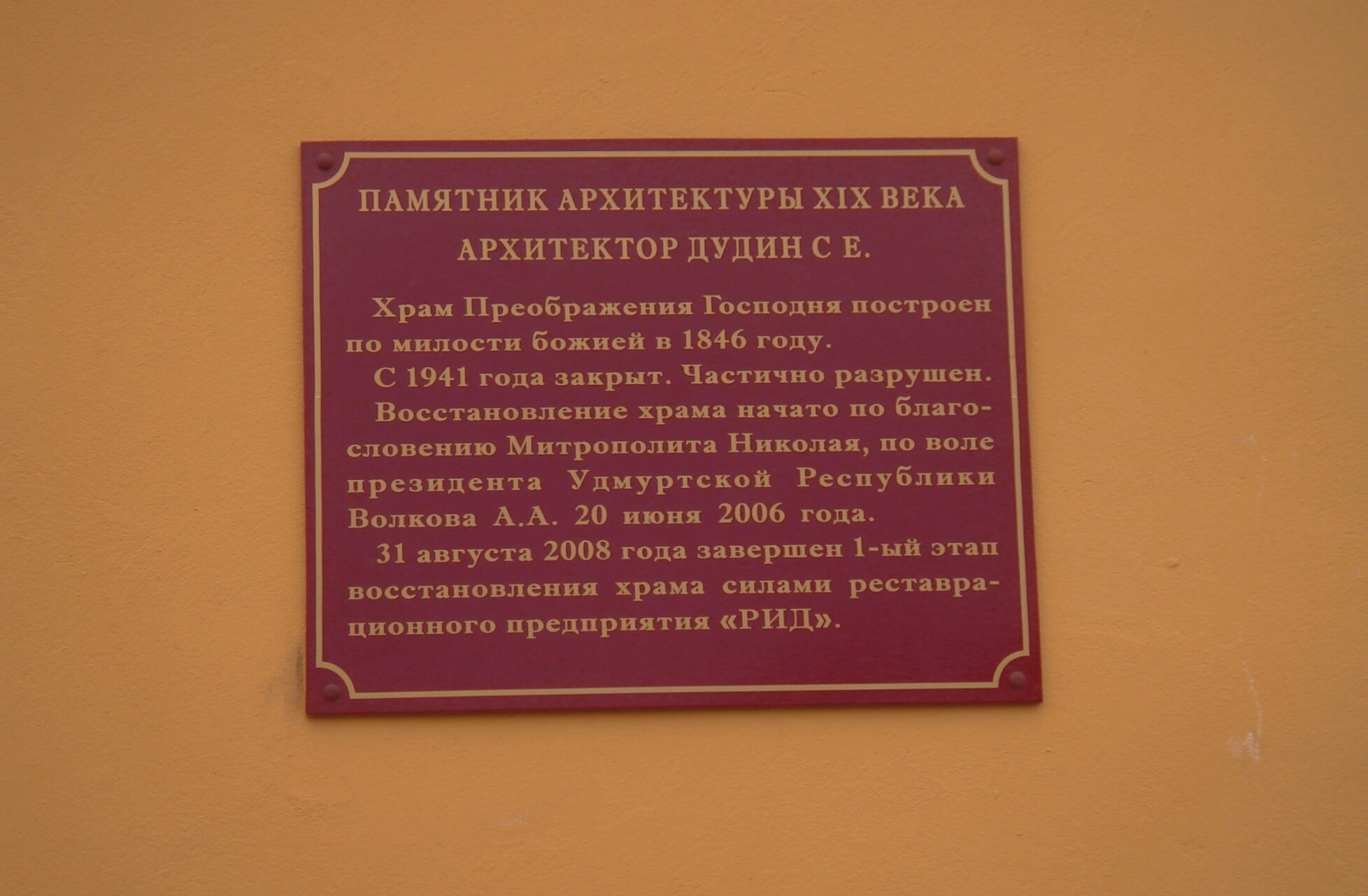 На фотографии запечатлена мемориальная доска, установленная на Храме Преображения Господня, расположенном в селе Мазунино Удмуртской Республики. Этот православный храм является памятником архитектуры XIX века, созданным по проекту архитектора С.Е. Дудина и освящённым в 1846 году.