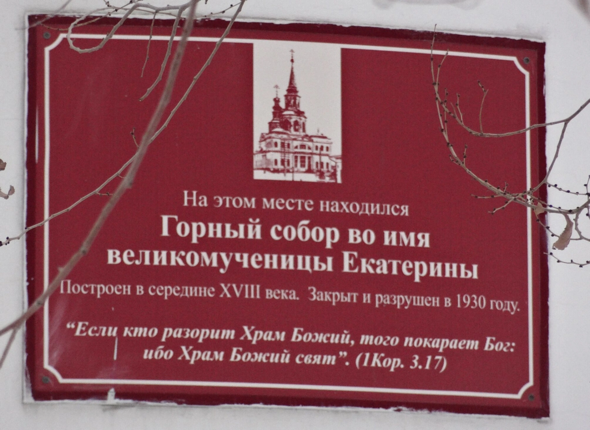 На представленной фотографии запечатлена мемориальная доска, установленная на историческом месте расположения Горного собора во имя святой великомученицы Екатерины в Екатеринбурге. Мемориальная композиция представляет собой прямоугольную плиту красного цвета с нанесённым белым текстом и графическим изображением.