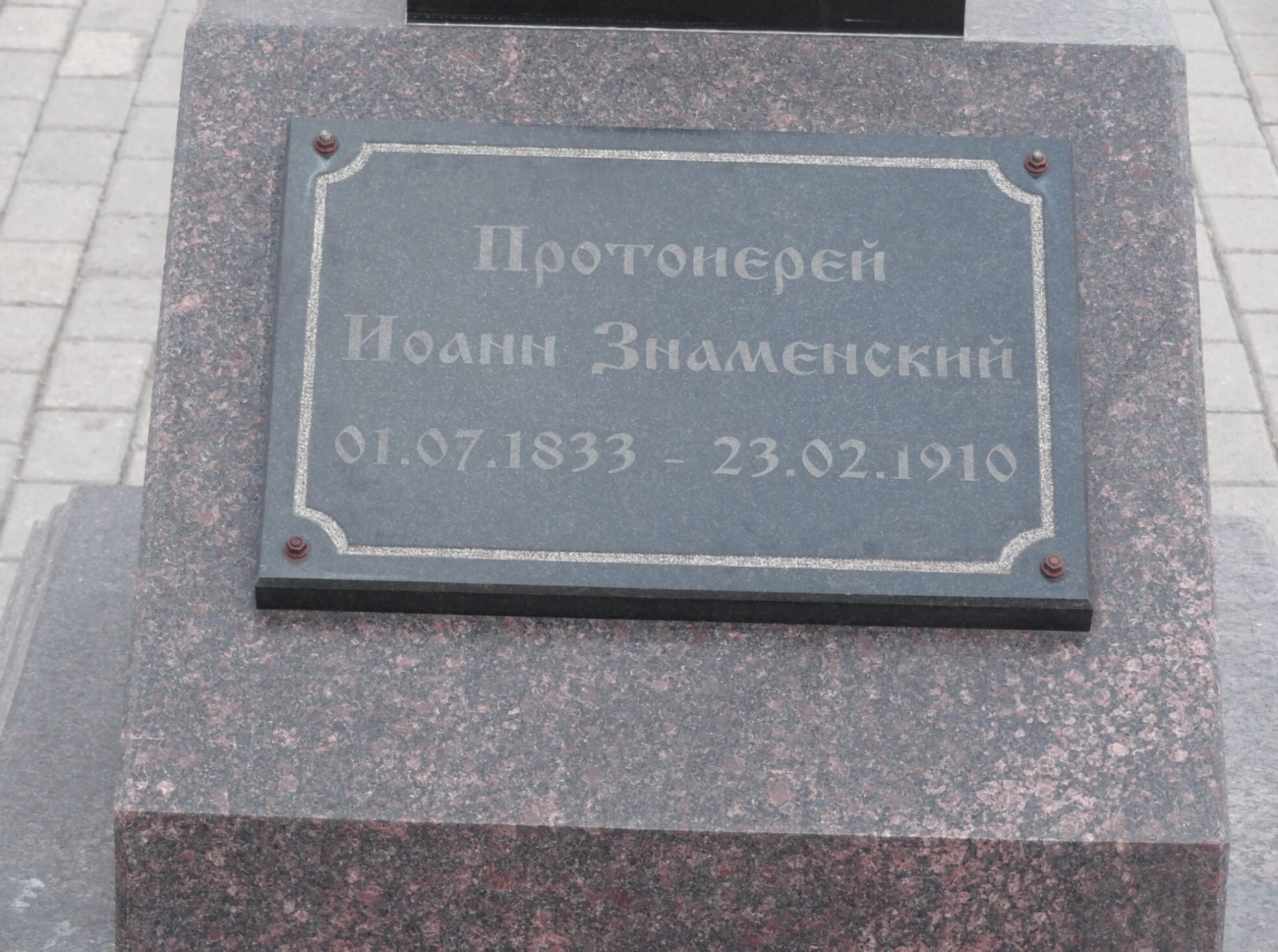 На представленной фотографии запечатлена мемориальная доска, установленная в храме-колокольне Большой Златоуст города Екатеринбурга. Памятный знак посвящён протоиерею Иоанну Знаменскому, о чём свидетельствует выгравированная надпись с указанием его сана, имени и дат жизни: 1 июля 1833 года — 23 февраля 1910 года.