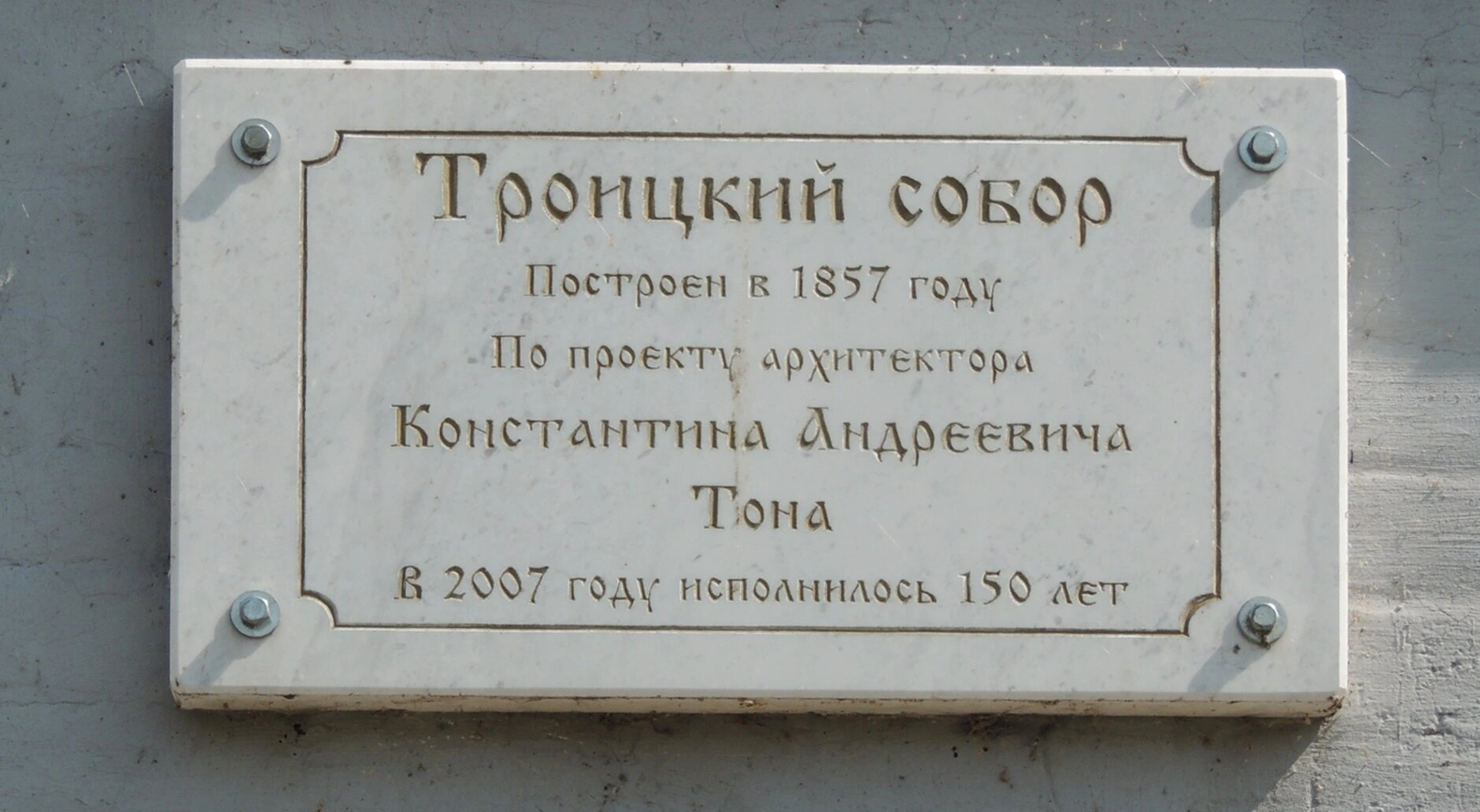 Текст на мраморной или каменной плите гласит, что собор был возведён в 1857 году по проекту выдающегося русского зодчего Константина Андреевича Тона, творчество которого во многом сформировало облик церковной архитектуры России XIX столетия. Упоминание о праздновании 150-летнего юбилея со дня постройки в 2007 году подчёркивает непреходящее значение этого духовного центра для верующих.