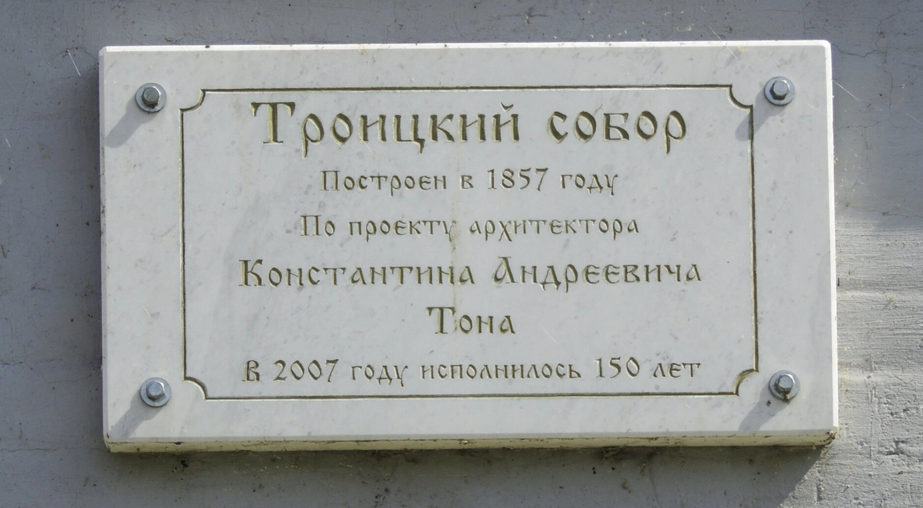 Согласно тексту на доске, Свято-Троицкий собор был возведён в 1857 году по проекту выдающегося русского зодчего Константина Андреевича Тона, творения которого во многом определили облик церковной архитектуры России XIX столетия. Храм был освящён в честь Святой Живоначальной Троицы, что символизирует единство и божественное начало.