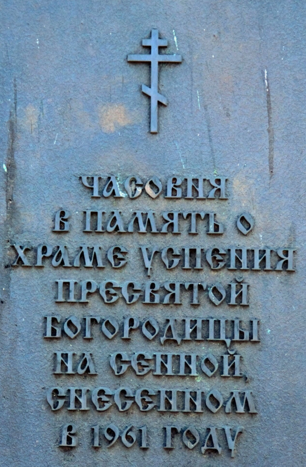 Доска выполнена из тёмного металла, на котором рельефно выделяются надписи и православный крест, венчающий композицию. Чётко читаемый текст на русском языке гласит: «ЧАСОВНЯ В ПАМЯТЬ О ХРАМЕ УСПЕНИЯ ПРЕСВЯТОЙ БОГОРОДИЦЫ НА СЕННОЙ СНЕСЕННОМ В 1961 ГОДУ». Этот памятный знак является не только напоминанием об утраченной святыне, но и символом покаяния и вечной памяти о поруганной святыне.