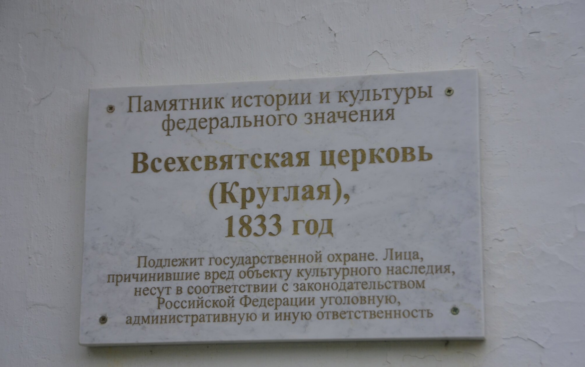 На представленной фотографии запечатлена информационная мемориальная доска, установленная на стене уникального храмового сооружения — Всехсвятской (Круглой) церкви в городе Тюмени. Данная табличка свидетельствует о высоком статусе объекта, являющегося памятником истории и культуры Российской Федерации.