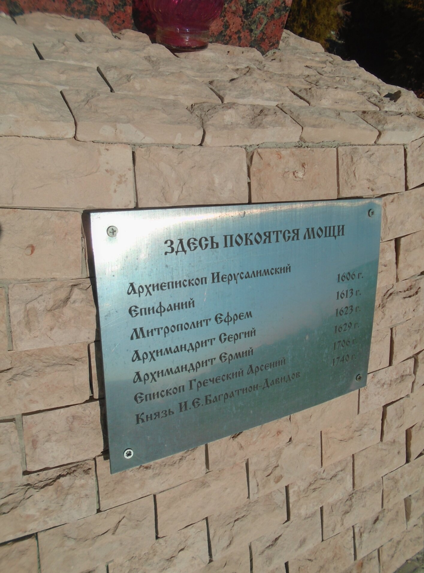 В списке первым указан Архиепископ Иерусалимский Спифаний, отошедший ко Господу в 1600 году. Далее следует Митрополит Ефрем, преставившийся в 1613 году. Третьим в перечне значится Архимандрит Сергий, чья земная жизнь завершилась в 1623 году. Четвёртым упомянут Архимандрит Ермий, почивший в 1629 году. Пятым указан Епископ Греческий Арсений, дата кончины которого не обозначена. Завершает список Князь И.С. Багратион-Давыдов, представитель знатного рода, известного своим служением православной вере.