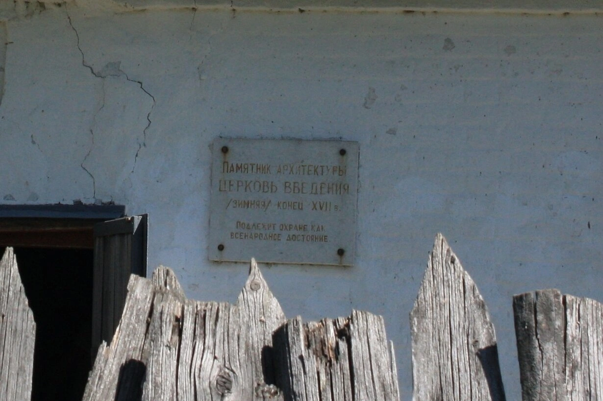 На представленной фотографии запечатлена стена старинного православного храма, на которой укреплена мемориальная табличка. Чётко читаемый текст на табличке гласит: «ПАМЯТНИК АРХИТЕКТУРЫ ЦЕРКОВЬ ВВЕДЕНИЯ / ЗИМНЯЯ КОНЕЦ XVII в. ПОДЛЕЖИТ ОХРАНЕ КАК ВСЕНАРОДНОЕ ДОСТОЯНИЕ». Этот охранный знак свидетельствует о высоком статусе объекта культурного наследия, которым является Введенская церковь в селе Сербилово Суздальского района Владимирской области.