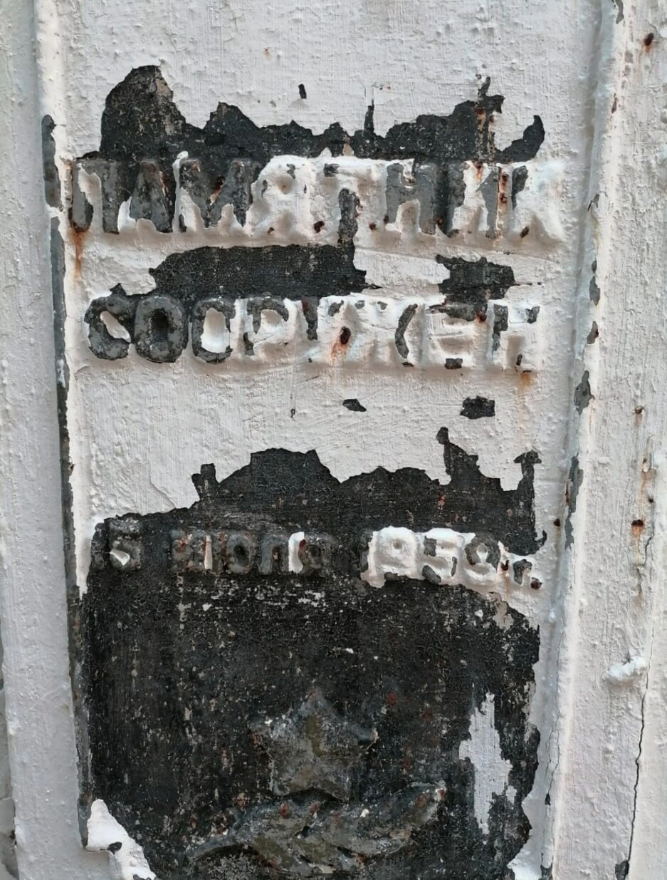 В верхней части таблички отчетливо читаются слова "ПАМЯТНИК" и "СООРУЖЕН", свидетельствующие о статусе данного сооружения как охраняемого памятника истории и культуры. Нижняя часть содержит дату возведения - 1959 год, что указывает на послевоенный период в истории советского государства. Примечательно наличие символики в виде пятиконечной звезды с серпом и молотом, характерной для того исторического периода.