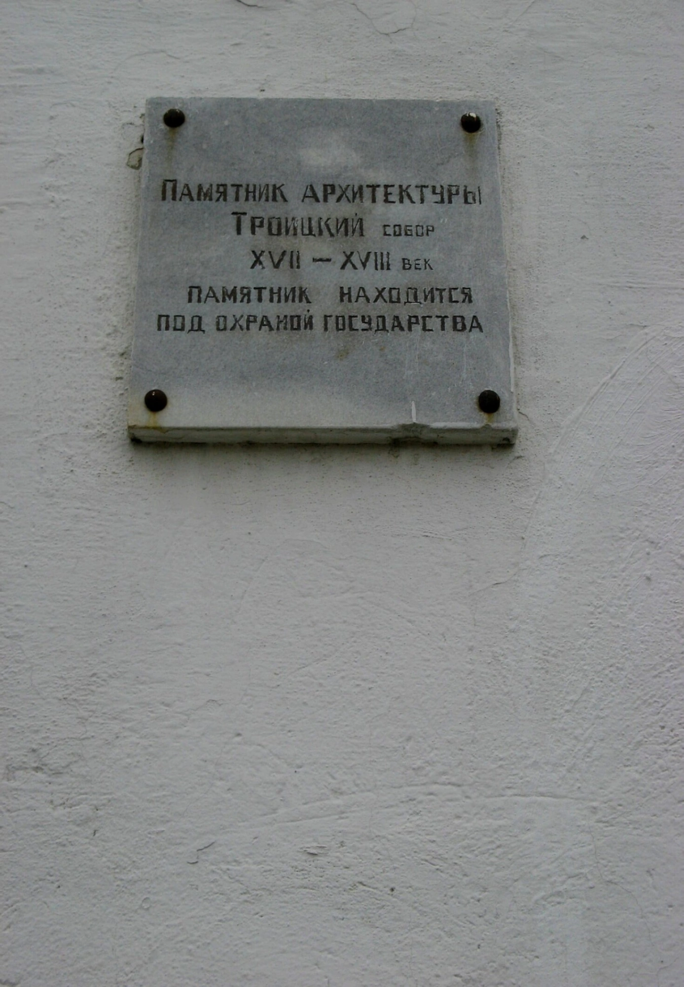 На представленной фотографии запечатлена мемориальная доска, установленная на стене Свято-Троицкого собора, что на Красной горе в древнем городе Серпухове. Чёткая надпись на табличке гласит: «ПАМЯТНИК АРХИТЕКТУРЫ ТРОИЦКИЙ СОБОР XVII - XVIII ВЕК ПАМЯТНИК НАХОДИТСЯ ПОД ОХРАНОЙ ГОСУДАРСТВА». Данный знак свидетельствует об особом статусе этого православного храма, признанного объектом культурного наследия.