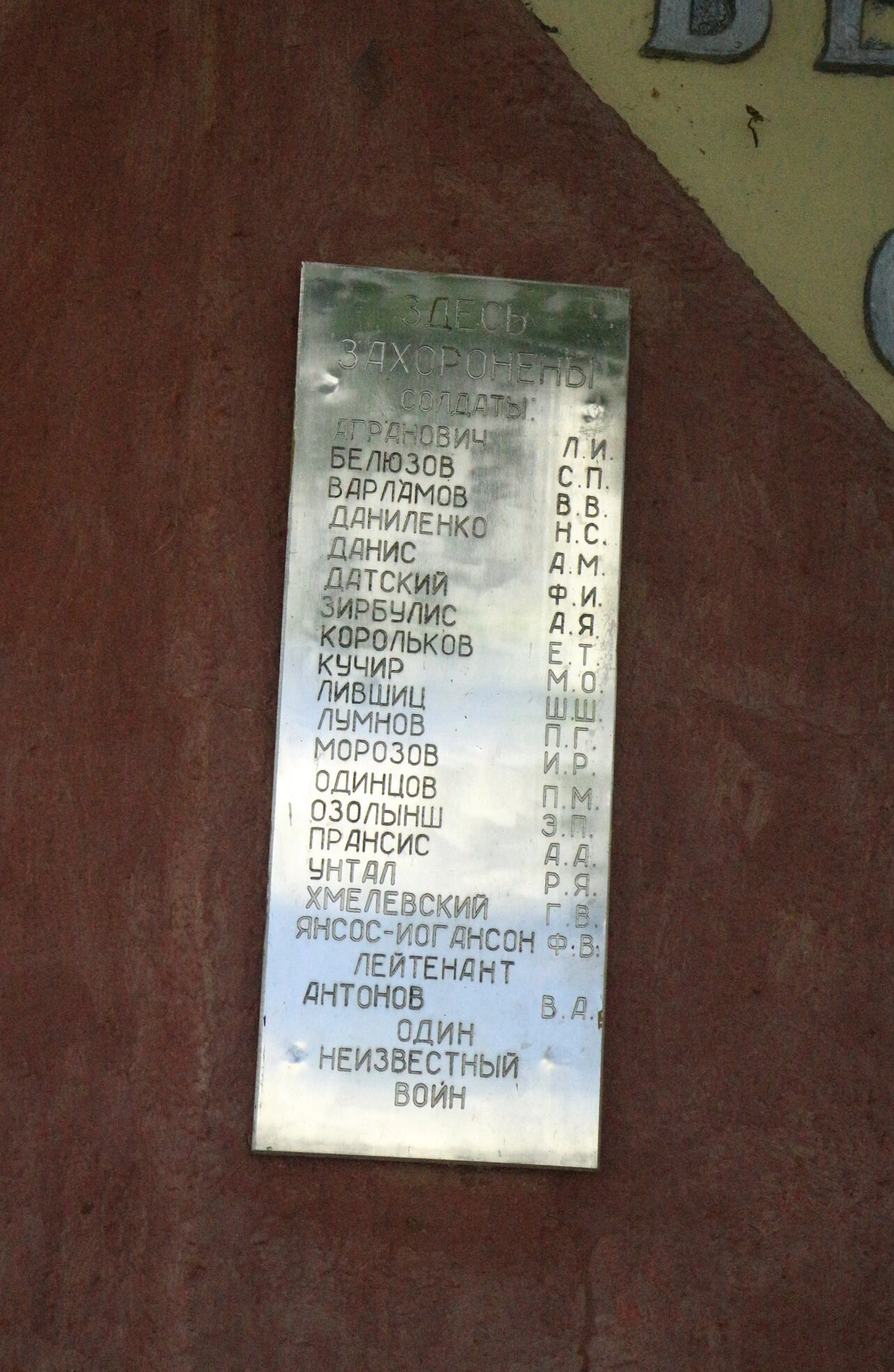 Металлическая памятная доска содержит выгравированный список имён воинов, отдавших свои жизни за Веру и Отечество. С благоговением и скорбью перечислены следующие имена: Агранович Л.И., Белюзов С.П., Варламов В.В., Даниленко Н.С., Данис А.М., Датский Ф.И., Зирбулис А.Я., Корольков Е.Т., Кучир М.О., Лумнов П.Г., Морозов И.Р., Одинцов П.М., Прансис З.П., Унтал А.А., Хмелевский Р.Я., Янсос-Иогансон Г.В.