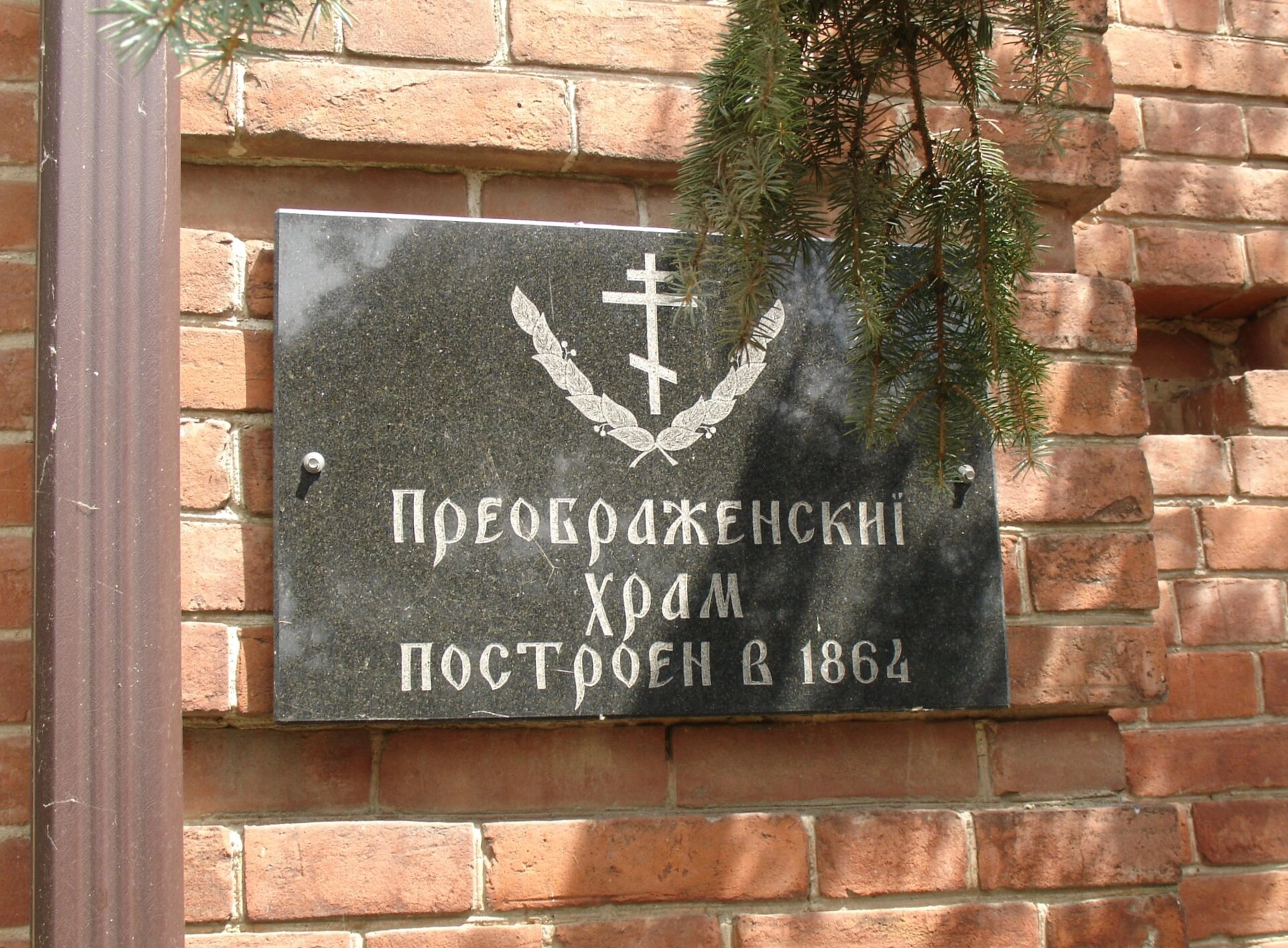 В верхней части таблички размещено рельефное изображение православного восьмиконечного креста, символизирующего искупительную жертву Спасителя. Под крестом высечена четкая надпись в дореформенной орфографии: «Преображенскiй Храм ПОСТРОЕН В 1864», что свидетельствует о почтенном возрасте церковного здания.