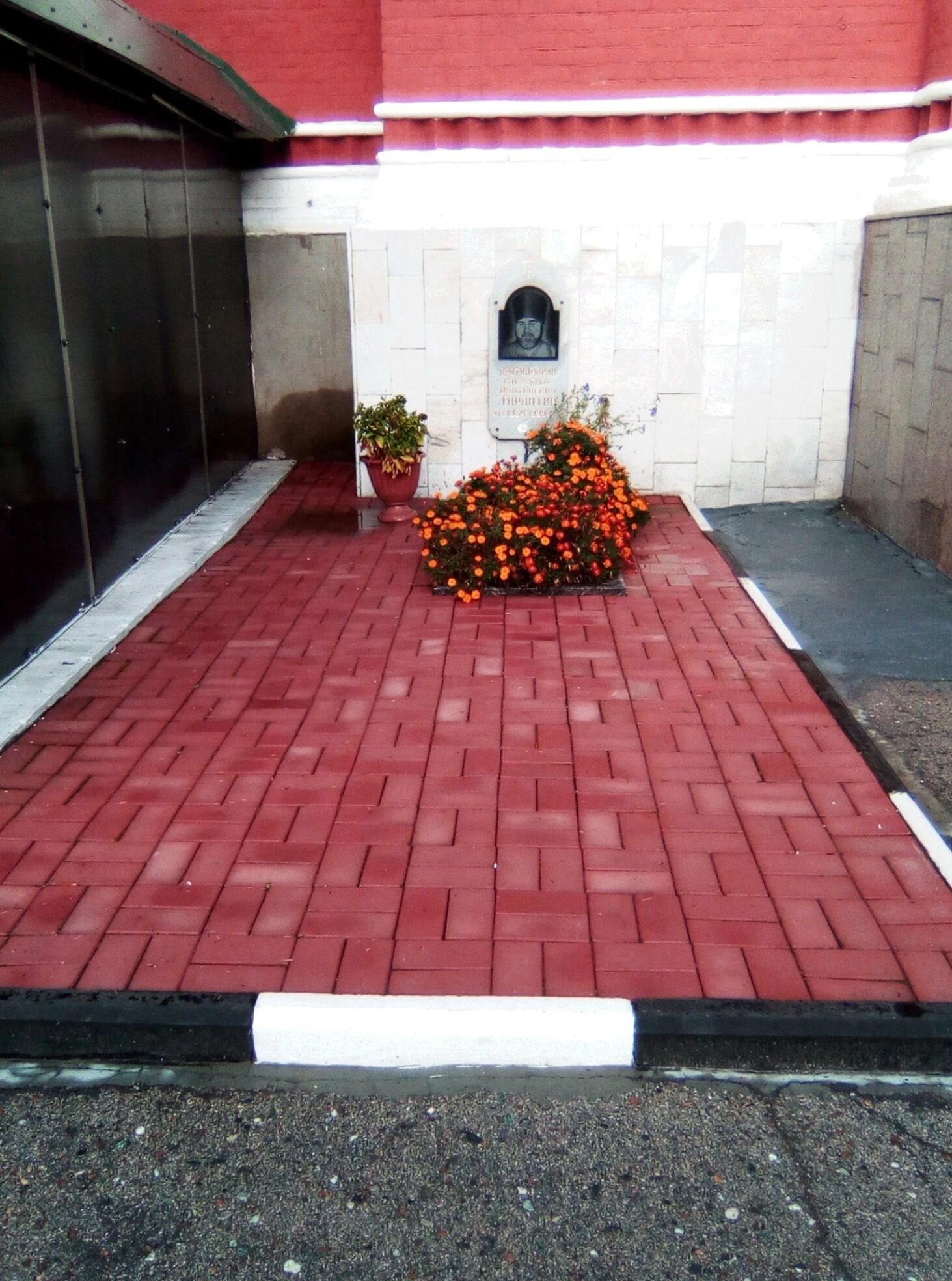 Задний план составляют стены самого храмового комплекса: массивная кирпичная кладка тёплого красного оттенка и тёмная стена, облицованная панелями. Вся композиция снимка передаёт атмосферу благоговения, памяти и умиротворения, свойственную этому святому месту. Вознесенская церковь, возведённая в конце XIX века, является объектом культурного наследия и одной из духовных доминант города, а подобные уголки на её территории благоустроены для молитвы и тихого созерцания.