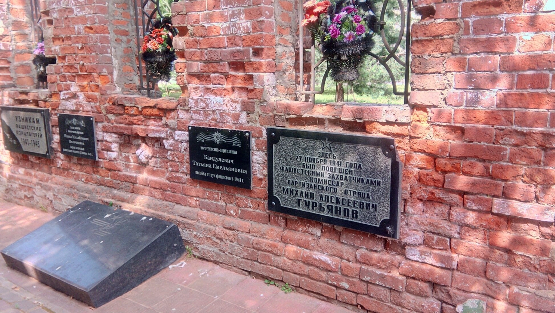 На сохранившемся участке кирпичной кладки закреплены несколько мемориальных досок, образующих своеобразный поминальный комплекс. Центральное место занимает памятная табличка, посвящённая комиссару партизанского отряда Михаилу Алексеевичу Гурьянову, принявшему мученическую кончину через повешение от рук немецко-фашистских захватчиков 27 ноября 1941 года. По левую сторону расположена доска в память о Татьяне Емельяновне Бандулевич, также погибшей от фашистов в 1941 году.