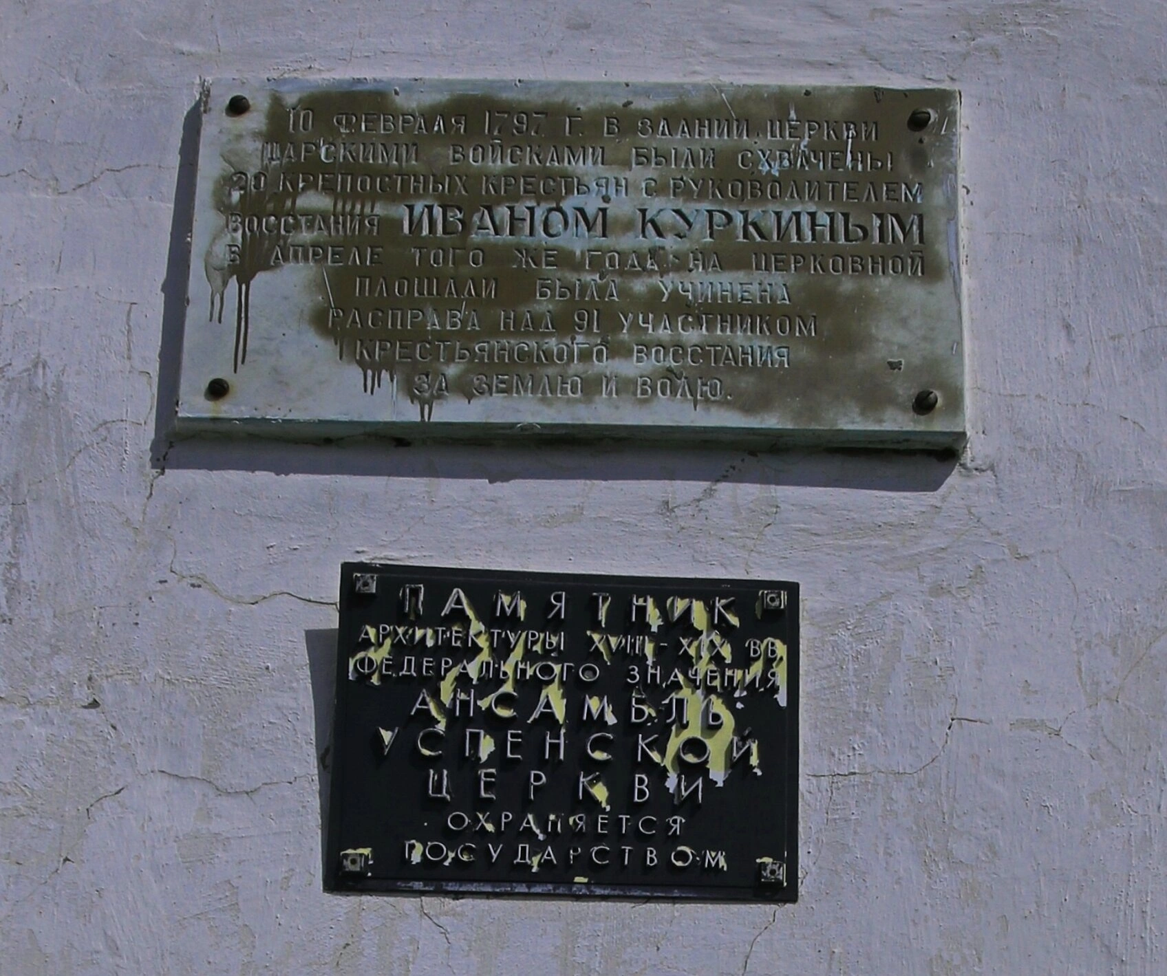 Верхняя мемориальная доска увековечивает трагические события февраля 1797 года, когда в стенах храма царскими войсками были схвачены двадцать крепостных крестьян под предводительством Ивана Куркина. В апреле того же года на церковной площади состоялась жестокая расправа над девяносто одним участником крестьянского восстания, боровшимся за землю и волю. Это историческое свидетельство напоминает о мужестве тех, кто отстаивал человеческое достоинство в тяжелейших условиях крепостничества.