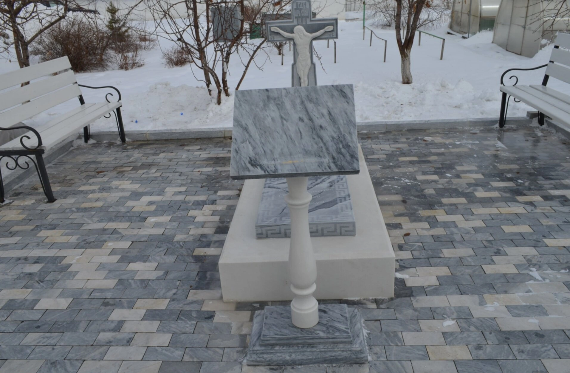 На представленной фотографии запечатлён фрагмент территории Спасо-Казанского женского монастыря, что в городе Троицке Челябинской области, в умиротворяющий зимний период. В центре композиции возвышается благоговейно установленный мраморный аналой, предназначенный для чтения Святого Евангелия и Богослужебных текстов во время совершения литий и панихид на монастырском кладбище.