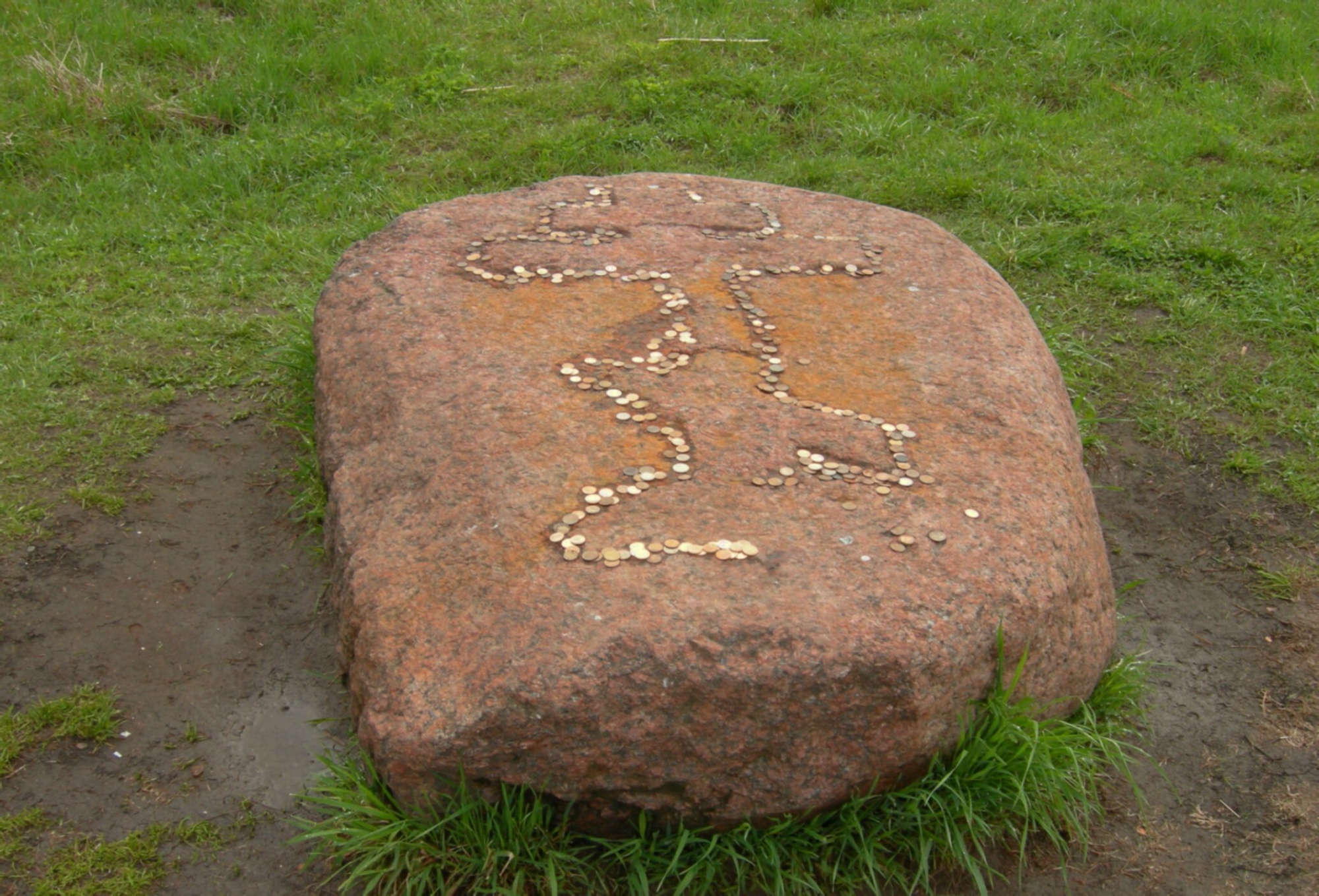 На представленной фотографии запечатлён исторический артефакт – древний межевой камень, обозначавший границы земельных владений Свято-Юрьева мужского монастыря, что под Великим Новгородом. Этот исполинский валун, немой свидетель многих веков, несёт на себе следы древних традиций и современного благочестия.