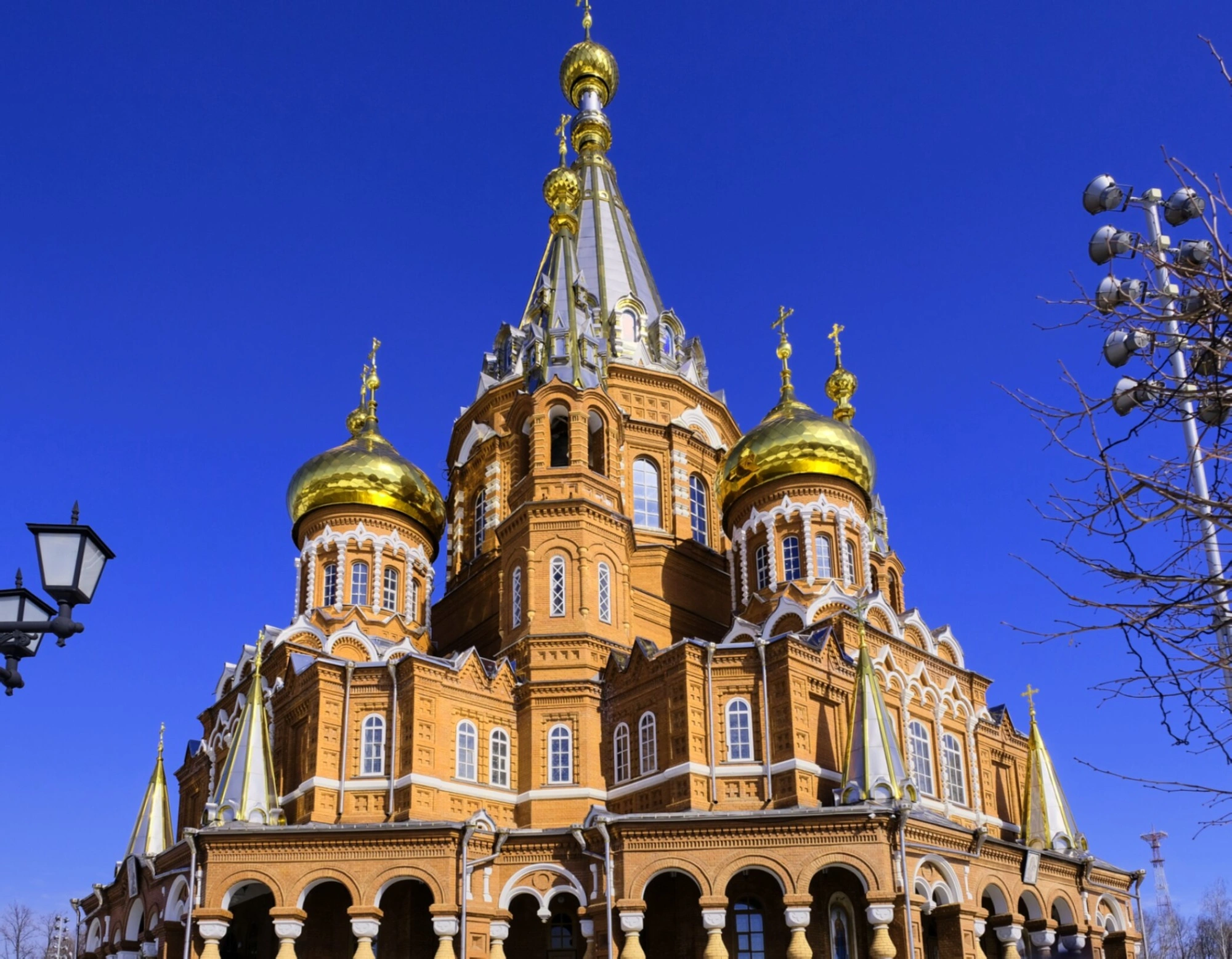 На представленной фотографии запечатлён величественный Михаило-Архангельский кафедральный собор, расположенный в самом сердце Ижевска. Этот православный храм, освящённый в честь предводителя Небесного Воинства Архангела Михаила, является одной из главных духовных доминант столицы Удмуртии.