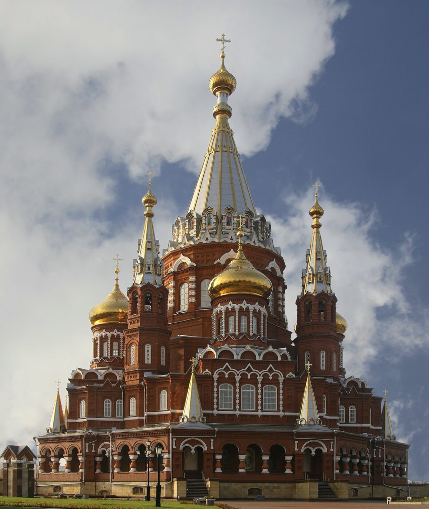 На представленной фотографии запечатлён величественный Михаило-Архангельский кафедральный собор, расположенный в самом сердце Ижевска на территории Центрального района. Этот православный храм, возведённый в честь святого Архистратига Михаила, является кафедральным собором Ижевской и Удмуртской епархии и занимает особое место в духовной жизни всего региона.