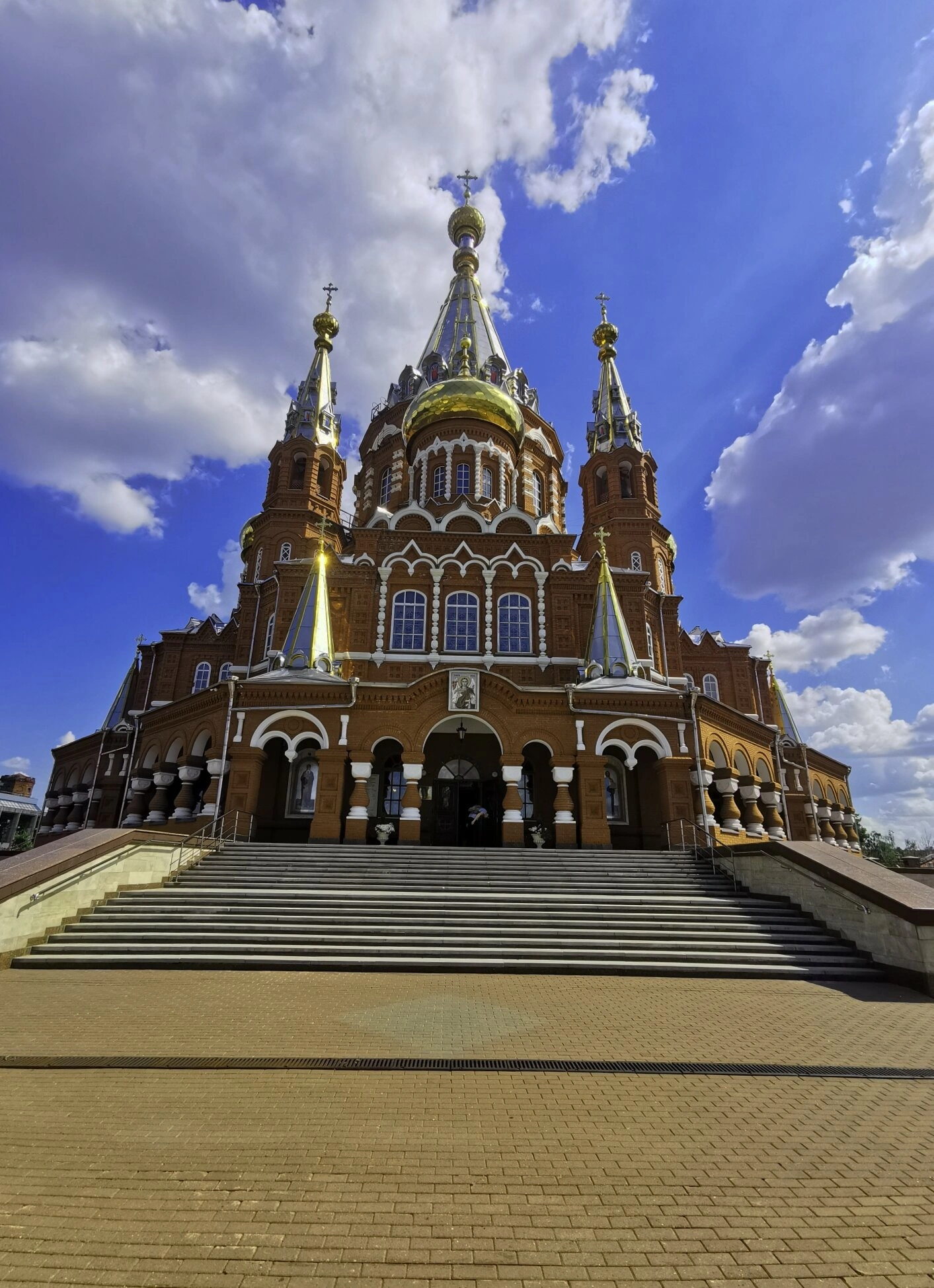 Собор, освящённый в честь предводителя Небесного Воинства Архангела Михаила, представляет собой монументальное кирпичное сооружение, выполненное в русско-византийском стиле. Его архитектурный облик поражает гармонией и величием: устремлённые ввысь золотые купола, сияющие на солнце, и лаконичные линии белоснежных стен создают образ небесной крепости. Центральный купол, символизирующий Христа, венчает массивный позолоченный крест, а окружающие его главки подчёркивают каноническую строгость композиции.