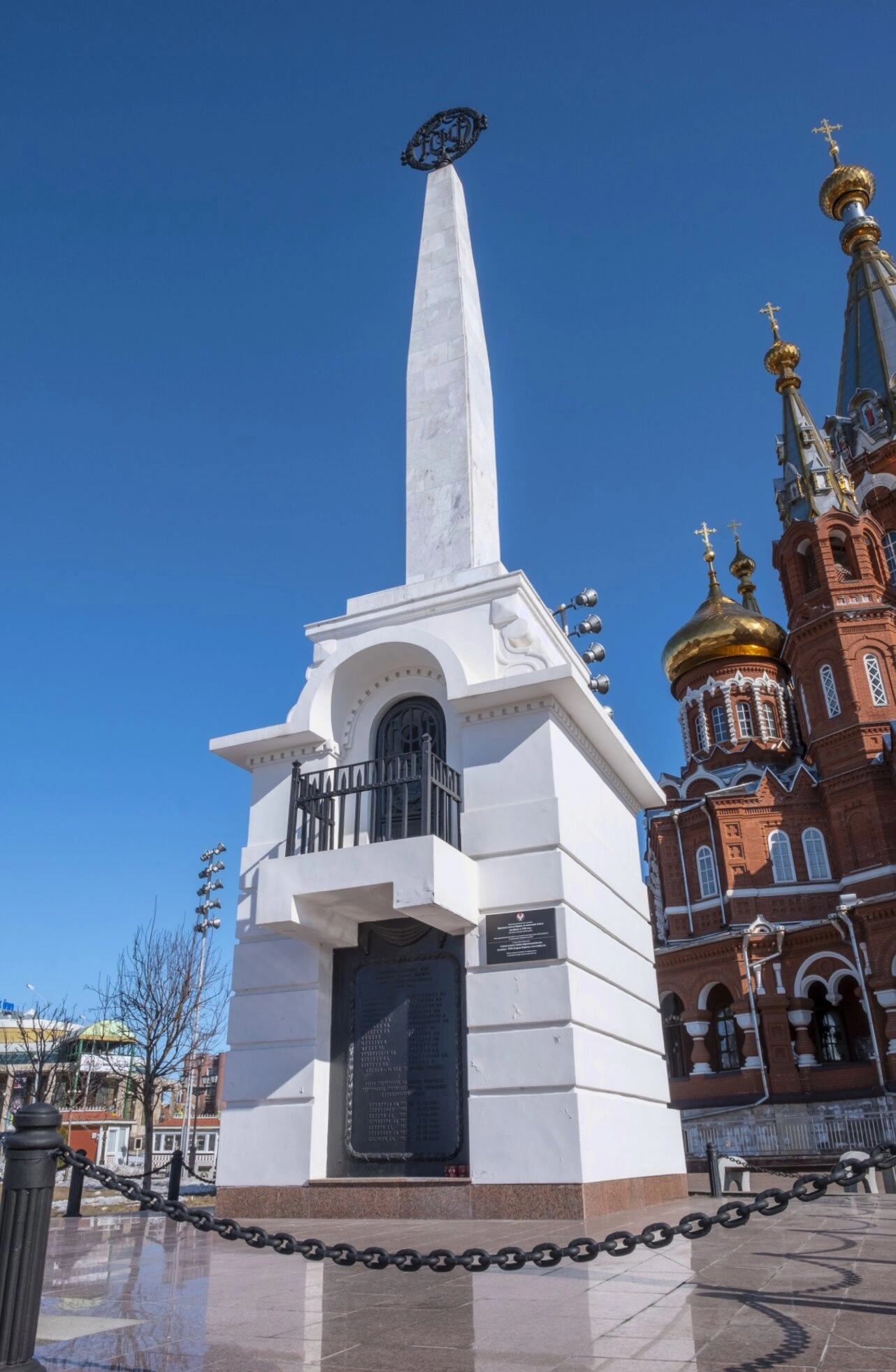 На переднем плане photographии расположен памятный обелиск, составляющий единый архитектурный ансамбль с собором. Белоснежный монумент, обрамлённый цепной оградой, служит напоминанием о воинской славе и духовном подвиге русского народа. У основания обелиска размещена мемориальная плита с памятными надписями.
