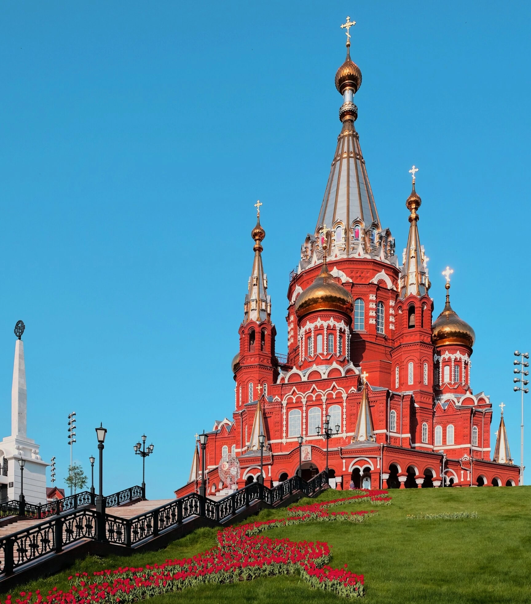 На представленной фотографии запечатлён величественный Михайло-Архангельский кафедральный собор, являющийся одной из главных православных святынь Ижевска и всей Удмуртской митрополии. Этот монументальный храм, освящённый в честь предводителя Небесного Воинства Архангела Михаила, служит кафедрой митрополита Ижевского и Удмуртского и является архитектурной доминантой исторического центра города.