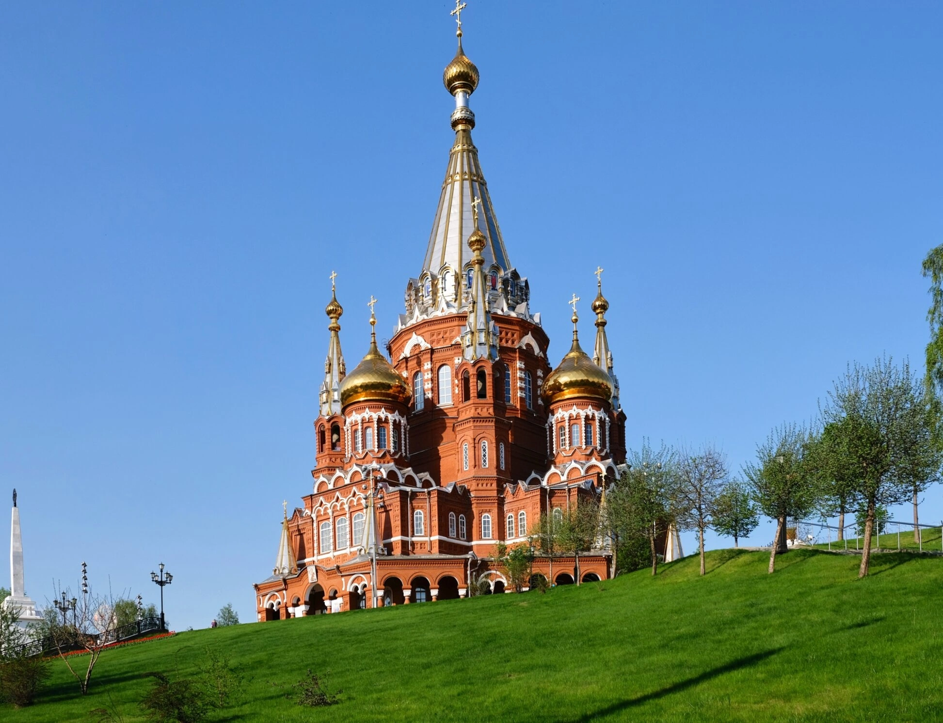 На фотографии запечатлён величественный Михайло-Архангельский кафедральный собор, являющийся главным православным храмом Ижевской епархии Русской православной церкви. Собор расположен в столице Удмуртской Республики на историческом месте, известном как Красная или Михайловская площадь, и занимает одну из самых высоких точек города, что символизирует его духовное возвышение.