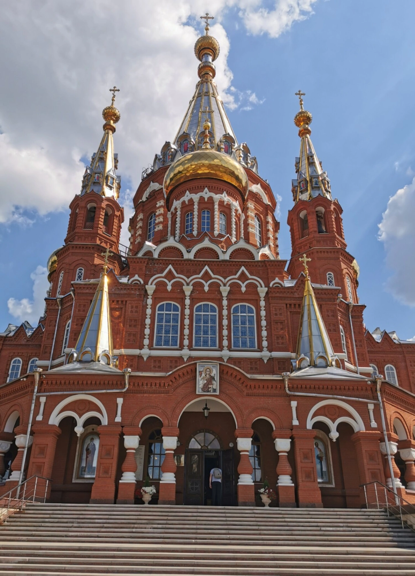 На фотографии запечатлён величественный Михайло-Архангельский кафедральный собор, воссозданный на своём историческом месте в столице Удмуртской Республики городе Ижевске. Этот православный храм, освящённый в честь предводителя Небесного Воинства Архангела Михаила, является главным кафедральным собором Ижевской и Удмуртской епархии.