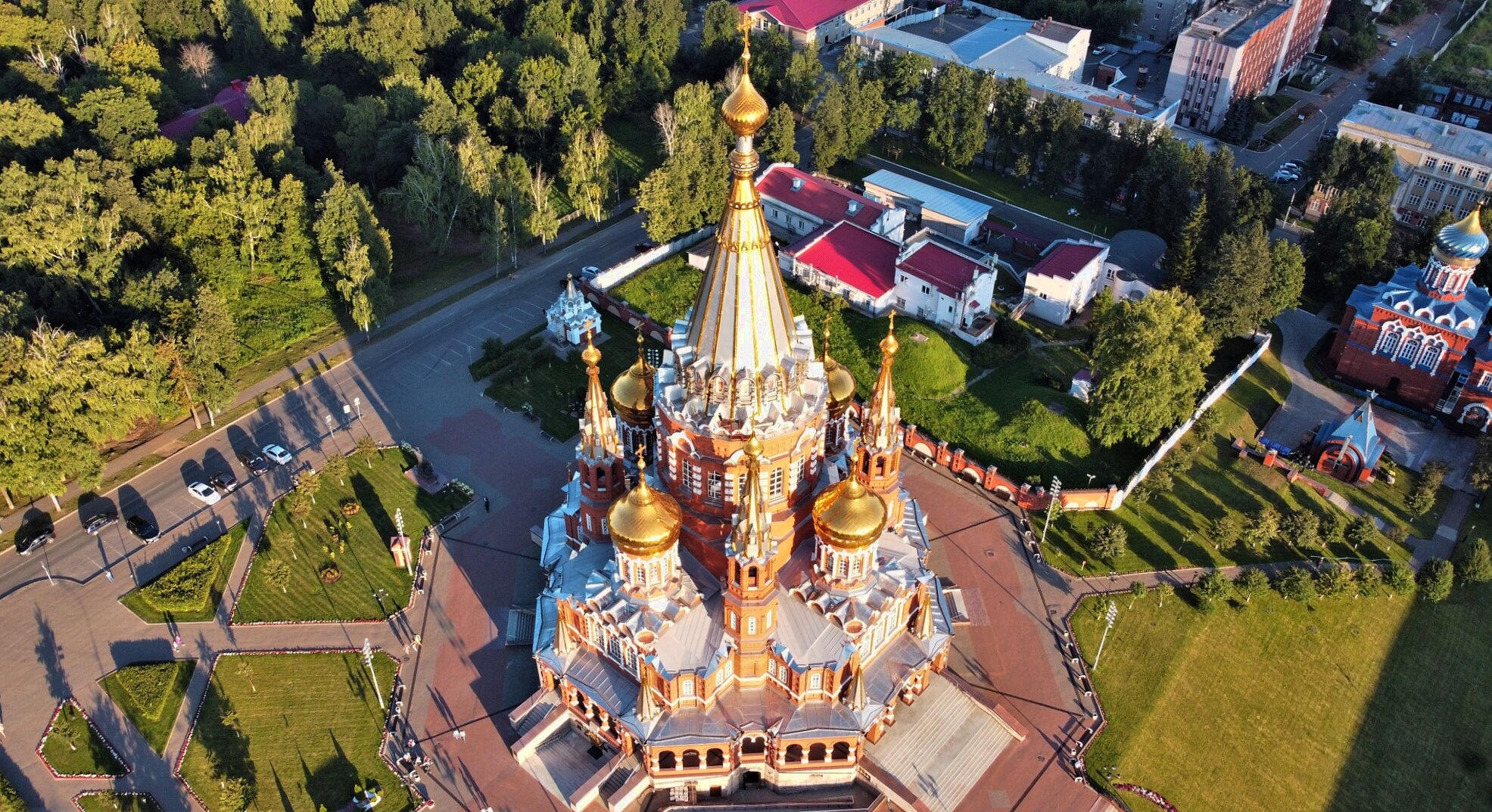 На представленной фотографии запечатлён величественный Михайло-Архангельский кафедральный собор, являющийся духовным символом и одной из главных православных святынь столицы Удмуртской Республики — города Ижевска. С высоты птичьего полёта открывается прекрасный вид на весь архитектурный ансамбль, демонстрирующий его монументальность и гармоничное расположение в городском пространстве.