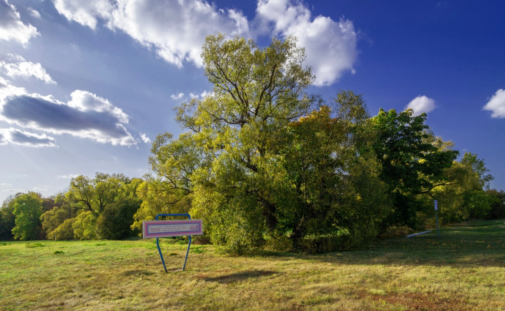 В левой части фотографии, у подножия центрального дерева, установлена небольшая памятная табличка на двух синих опорах. Хотя содержание надписи неразборчиво, подобные знаки часто устанавливаются в местах, связанных с историей православных храмов и духовными традициями.