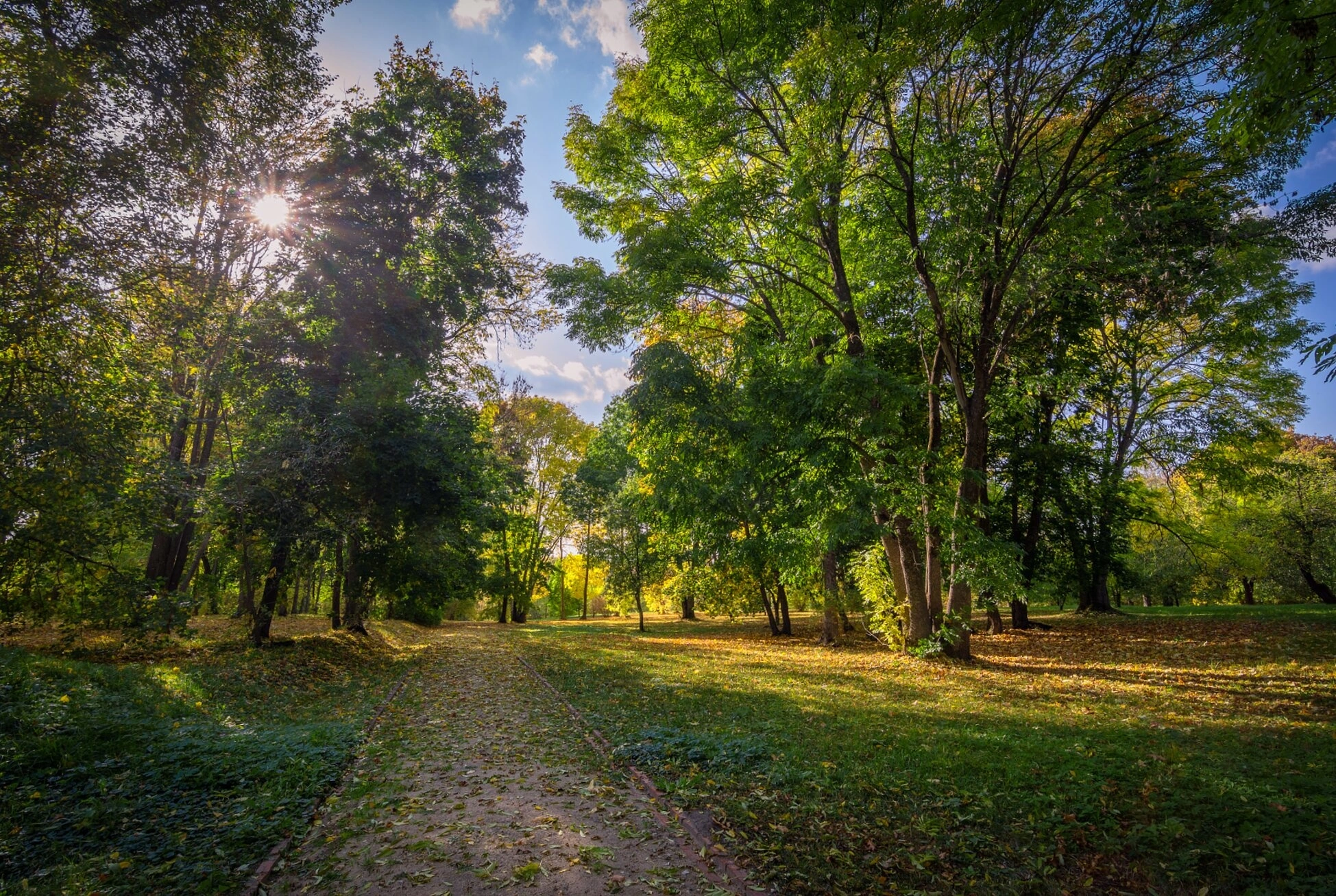 В золотистом свете осеннего дня тропа, усыпанная опавшими листьями, ведёт взгляд вглубь паркового ландшафта. Деревья, одетые в осенний убор, образуют естественный коридор, направляющий паломников и посетителей к храму. Солнечные лучи, проникая сквозь ажурную листву, создают игру света и тени, наполняя пространство особой духовной гармонией.