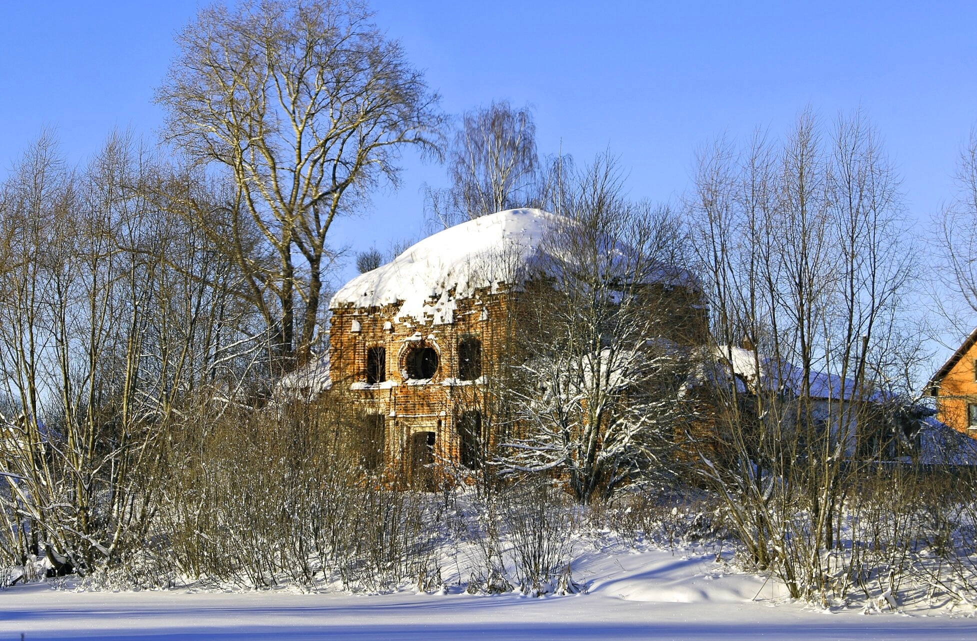 Здание церкви, выполненное из красного кирпича, предстаёт перед зрителем в зимнем убранстве. Снежный покров мягко лёг на разрушенные стены и уцелевшие архитектурные элементы, создавая пронзительный образ забвения и вечной памяти. Заснеженные деревья и кустарники, окружающие храм, подчёркивают уединённость и заброшенность этого святого места.