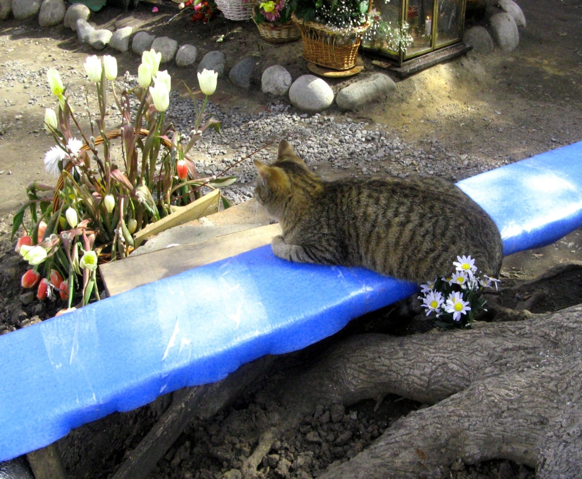 На представленной фотографии запечатлён умиротворяющий образ одного из обитателей Донского ставропигиального мужского монастыря — полосатого кота, мирно почивающего на синем утепляющем материале. Снимок был сделан в мае 2015 года на территории одной из древнейших православных обителей столицы, основанной в честь Донской иконы Божией Матери.