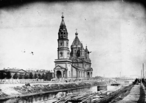 На представленной исторической фотографии запечатлена Церковь священномученика Мирония лейб-гвардии Егерского полка, располагавшаяся в Санкт-Петербурге на набережной Введенского канала. Храм был построен в 1849-1855 годах по проекту архитектора А.К. Тона и освящён в честь небесного покровителя шефа полка - священномученика Мирония.