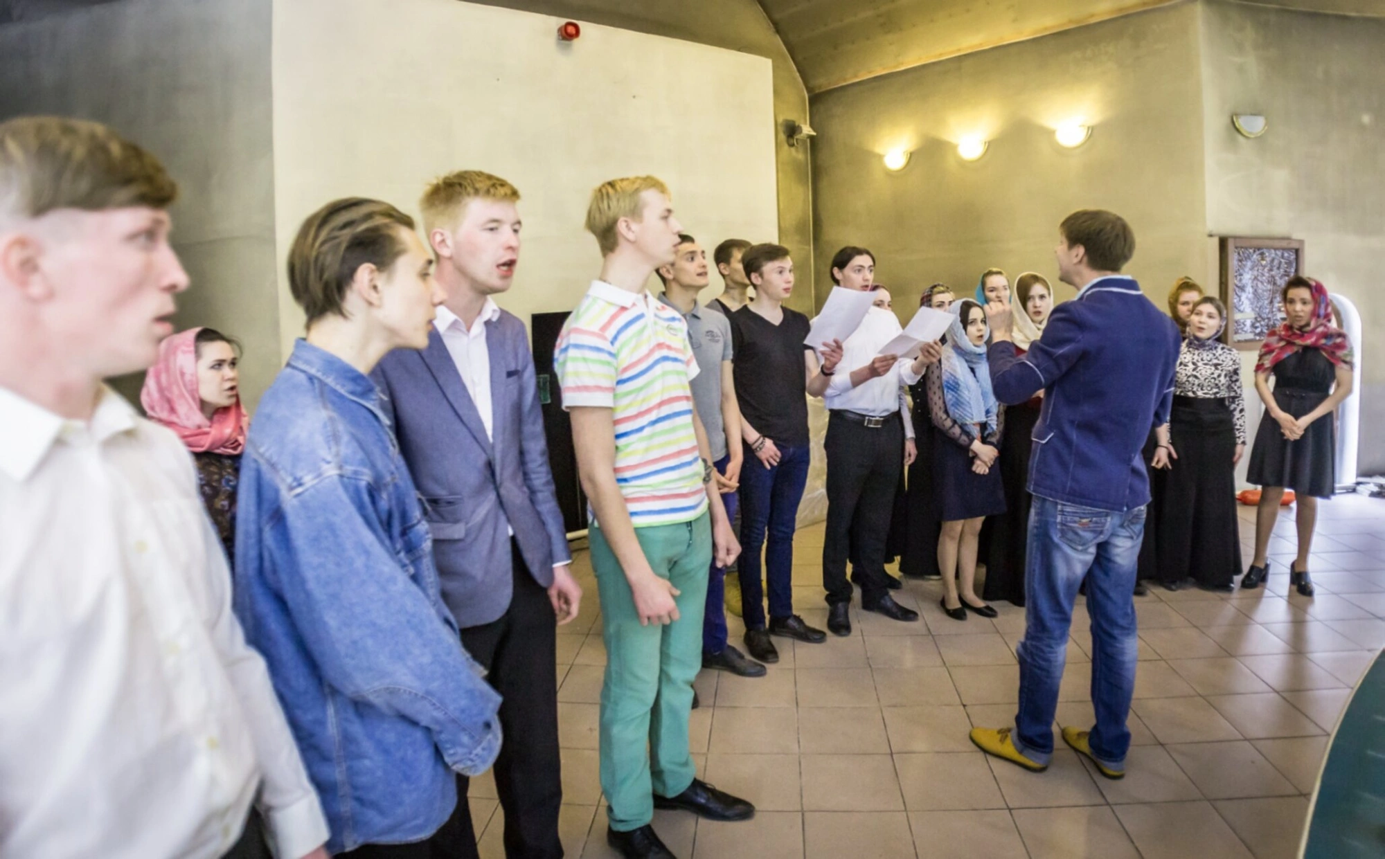 Просторное помещение со светлыми стенами и высокими потолками, украшенными настенными светильниками, является частью церковного комплекса. Вероятно, это актовый зал или класс воскресной школы, где проходят репетиции и собрания общины. Данное изображение ярко иллюстрирует активную молодёжную деятельность в стенах древнего храма, демонстрируя преемственность поколений и живую традицию церковного пения. Молодые люди, участвующие в богослужебной жизни, являются будущим Русской Православной Церкви.