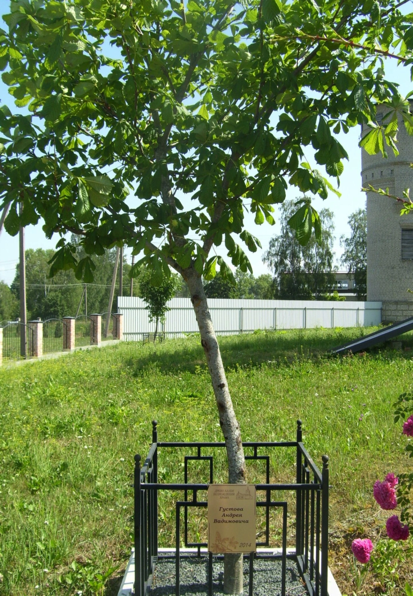 Согласно табличке на подпорке, дерево было посажено в 2014 году, что указывает на продолжающиеся труды по благоустройству и озеленению церковного двора. Зелёный газон и цветущие растения, среди которых угадываются розы, создают атмосферу уюта и молитвенного покоя, приличествующую дому Божиему.
