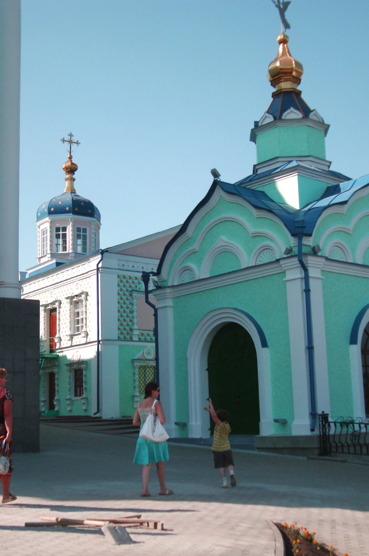 Слева от часовни виднеется величественный храм монастыря, фасад которого выполнен в благодатных бирюзовых тонах, украшен белоснежными декоративными элементами и увенчан синим куполом с золотым крестом. Данная цветовая гамма является отличительной чертой обители, создающей её уникальный и узнаваемый облик.