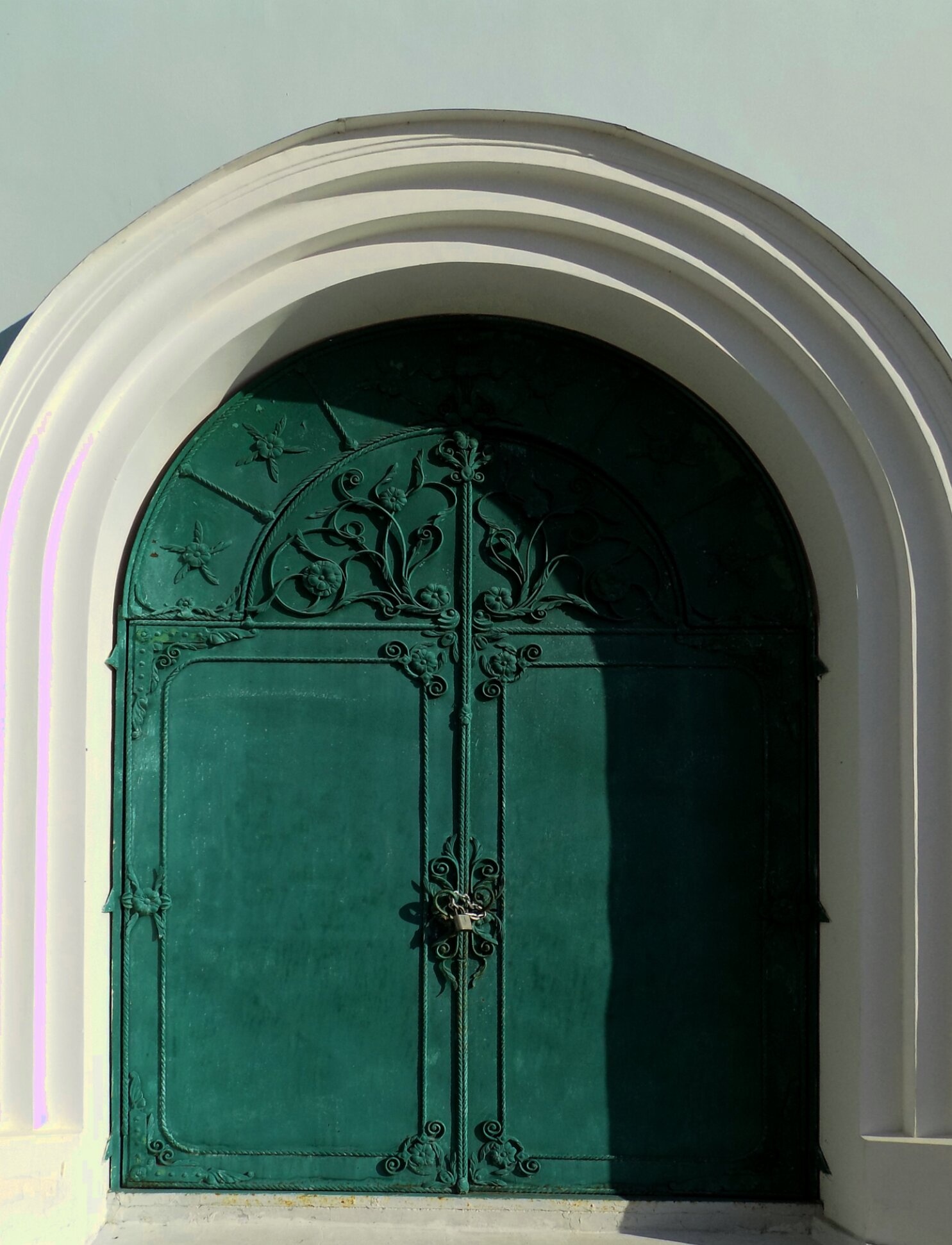 На представленной фотографии запечатлены монументальные врата, являющиеся частью архитектурного ансамбля мужского монастыря Коренная пустынь, что расположен в Курской области. Дверное полотно, выполненное из прочного металла и окрашенное в насыщенный изумрудно-зеленый цвет, установлено в арочном белокаменном проеме. Верхняя часть врат украшена изящным кованым орнаментом с растительными мотивами и символическими звездообразными элементами, отсылающими к небесной славе.