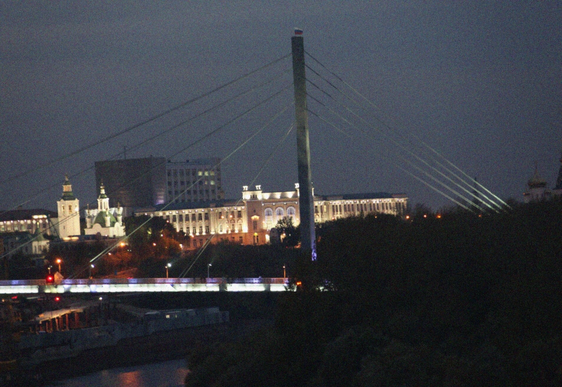 На представленной фотографии запечатлён живописный ночной вид в городе Тюмени. Центральным объектом композиции является пешеходный Мост Влюбленных, перекинутый через воды реки Туры. Его изящные конструкции искусно подсвечены, создавая романтическую атмосферу и отражаясь в тёмных водах реки.