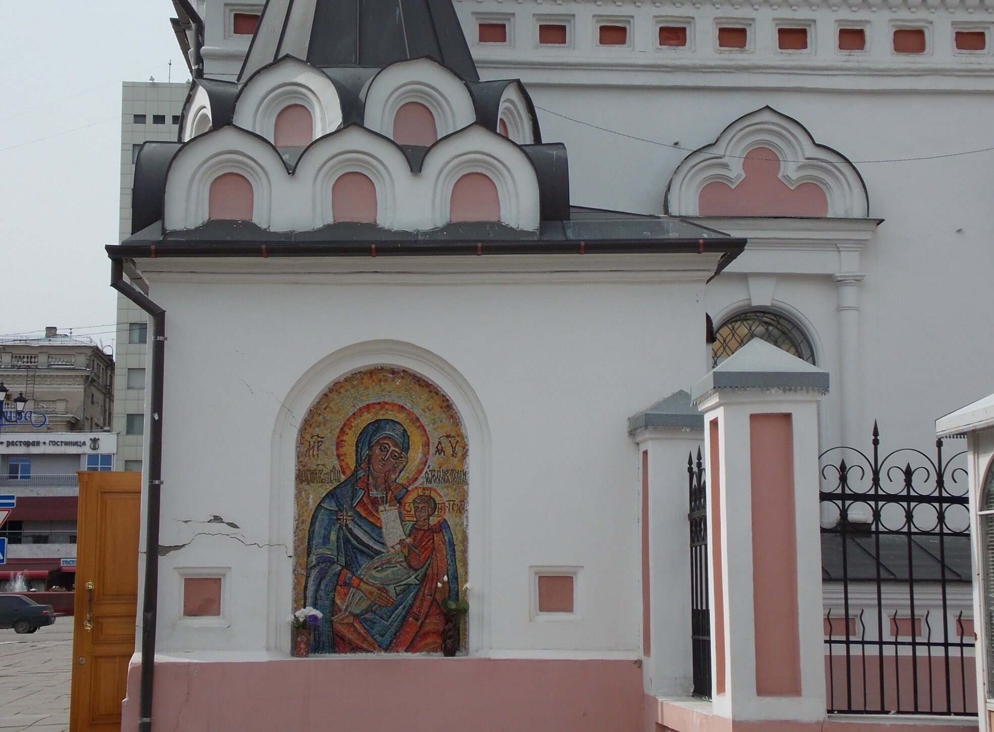 На заднем плане фотографии читаются элементы городской среды, что подчёркивает неразрывную связь духовной жизни храма с повседневностью города. Сама святыня, запечатлённая на изображении, является не только украшением церковных стен, но и объектом молитвенного почитания, напоминая всем взирающим на неё о заступничестве и утешении, которые Пресвятая Богородица дарует всем притекающим к Ней в скорбях и нуждах.