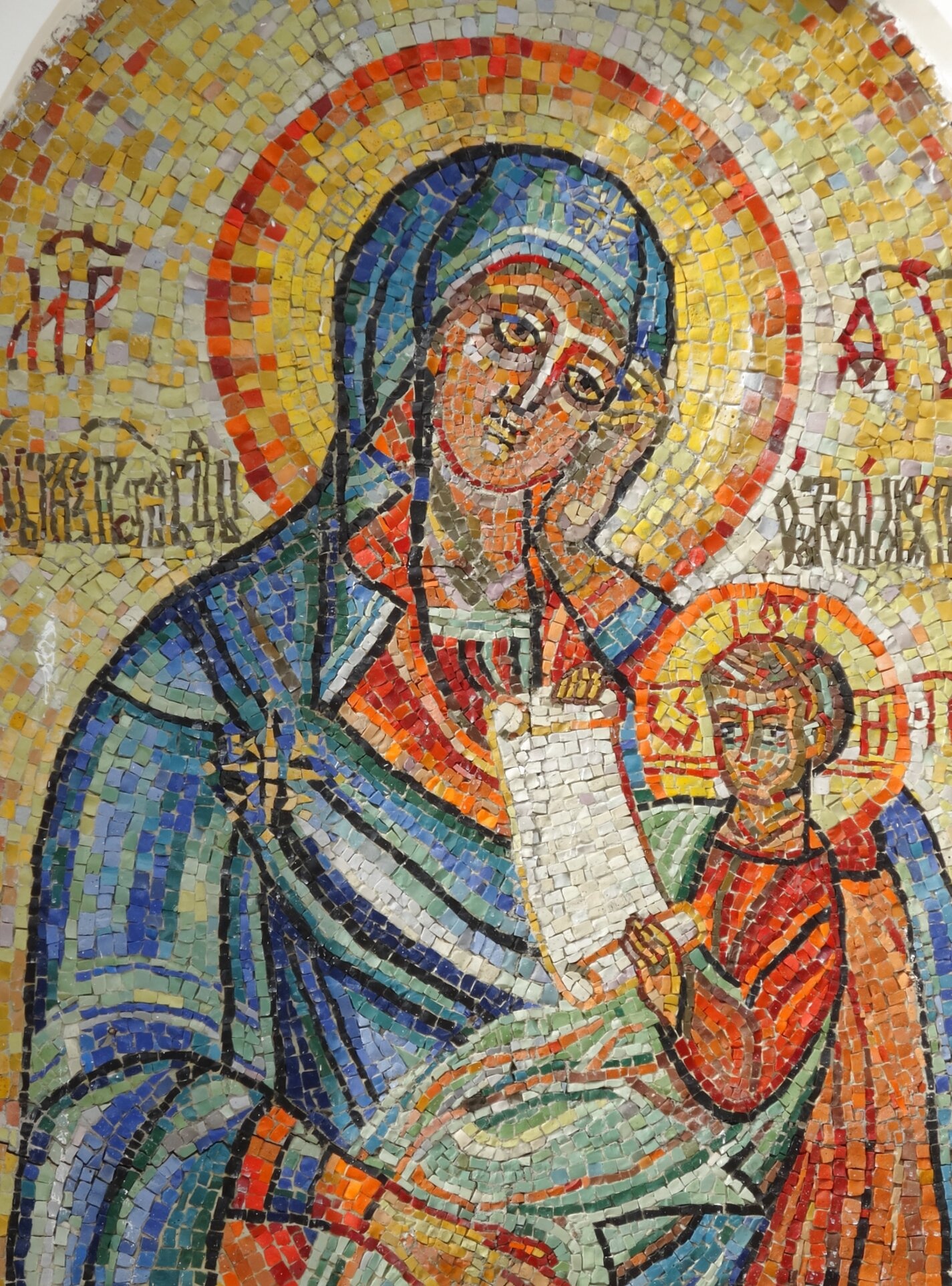 По сторонам от святых образов размещены традиционные греческие монограммы: MP ΘY (Матерь Божия) слева от Богородицы и IC XC (Иисус Христос) справа от Младенца. Художественное исполнение мозаики демонстрирует высокое мастерство иконописца, сохраняющего каноны православной иконографии. Цветовая палитра сочетает золотые фоны, символизирующие Божественный свет, и насыщенные пурпурные тона одеяний, указывающие на царское достоинство Христа и Богородицы.