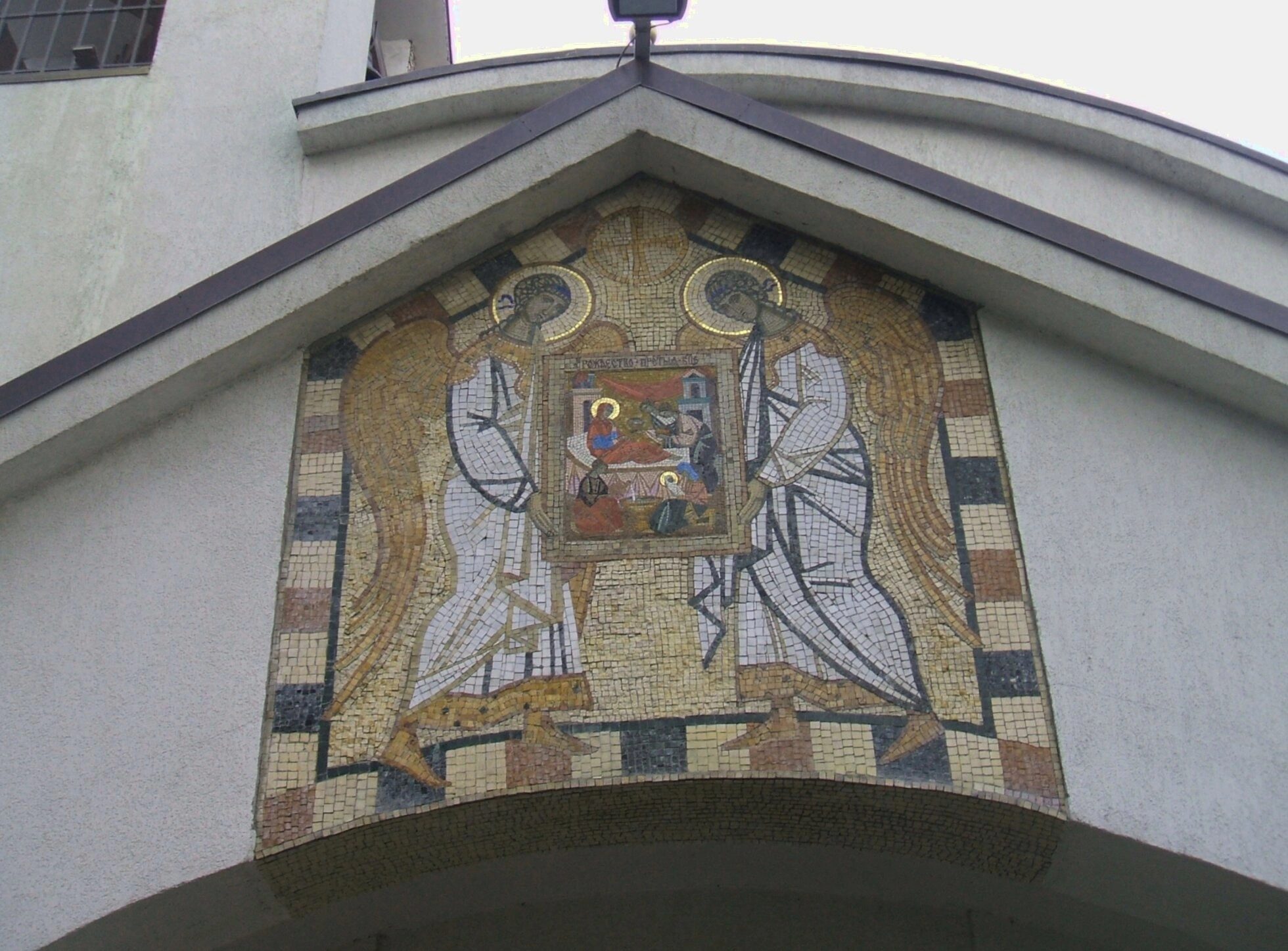 На фотографии запечатлена величественная мозаичная икона, украшающая фасад храма в честь Рождества Пресвятой Богородицы в городе Сестрорецке. Мозаика, выполненная в традициях византийского церковного искусства, изображает одно из ключевых событий в истории спасения человечества — рождение Девы Марии, будущей Матери Спасителя.