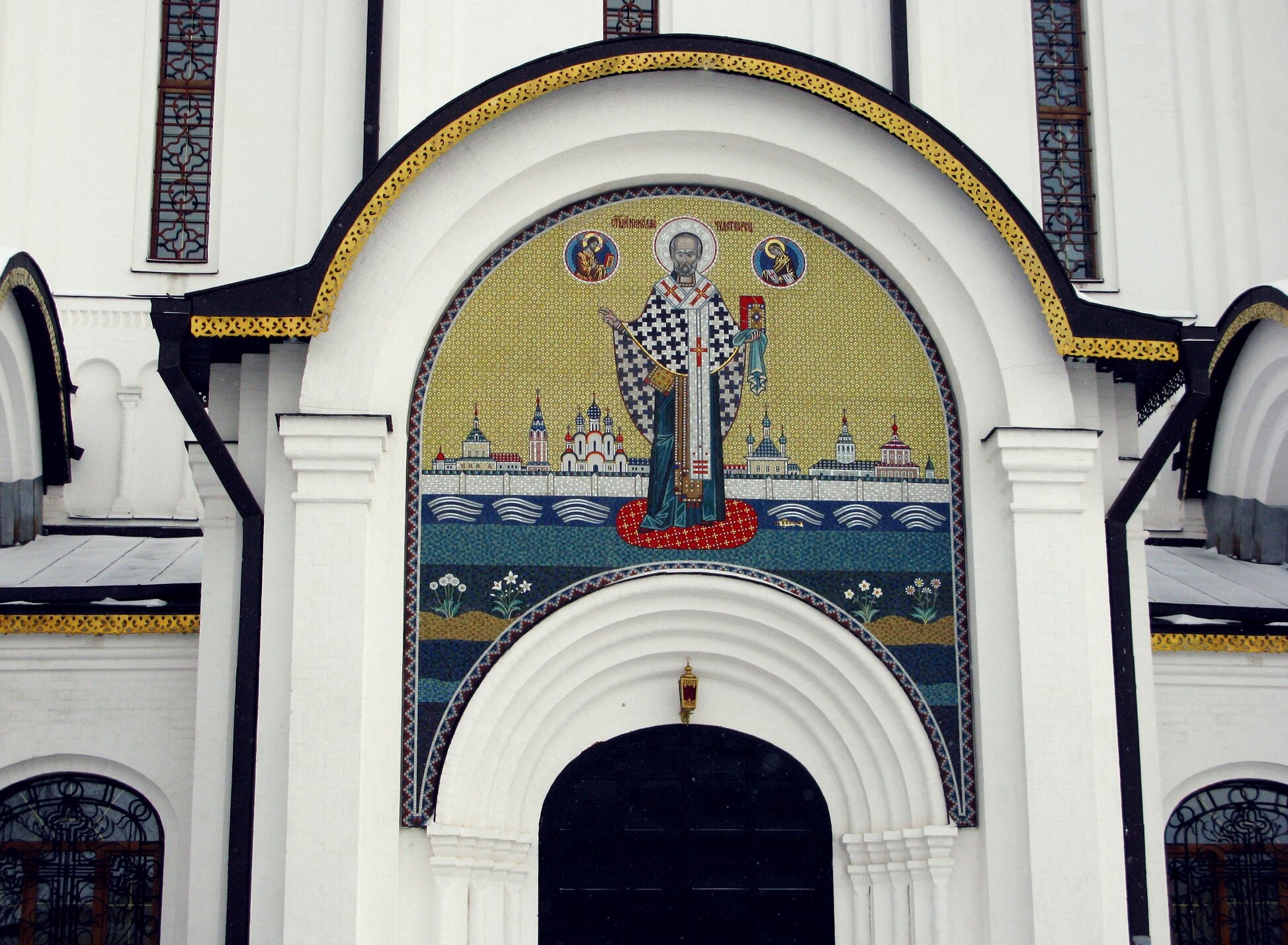 Мозаичная икона святителя Николая Чудотворца над входом в Никольский собор