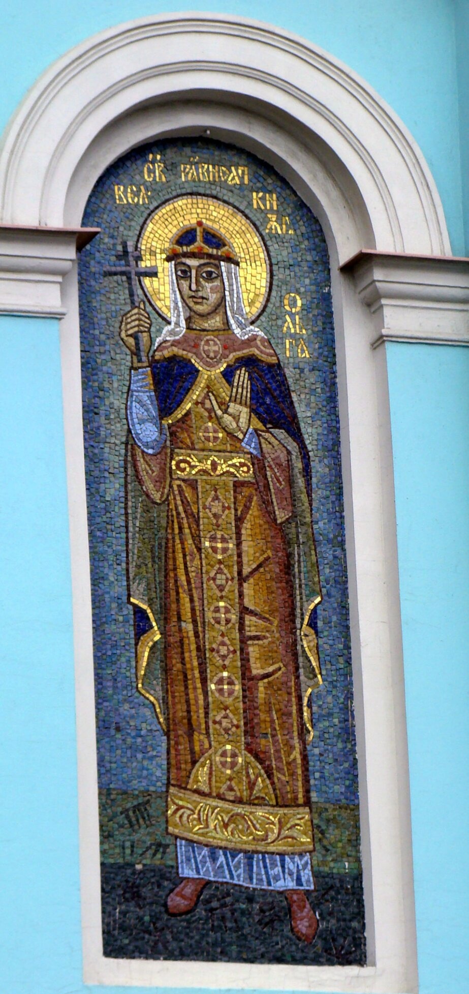 На представленной фотографии запечатлена величественная мозаичная икона, украшающая фасад храма преподобного Сергия Радонежского в Рогожской слободе Москвы. Священное изображение представляет образ святой мученицы Перпетуи Карфагенской – раннехристианской святой, принявшей мученическую кончину в 203 году в Карфагене.