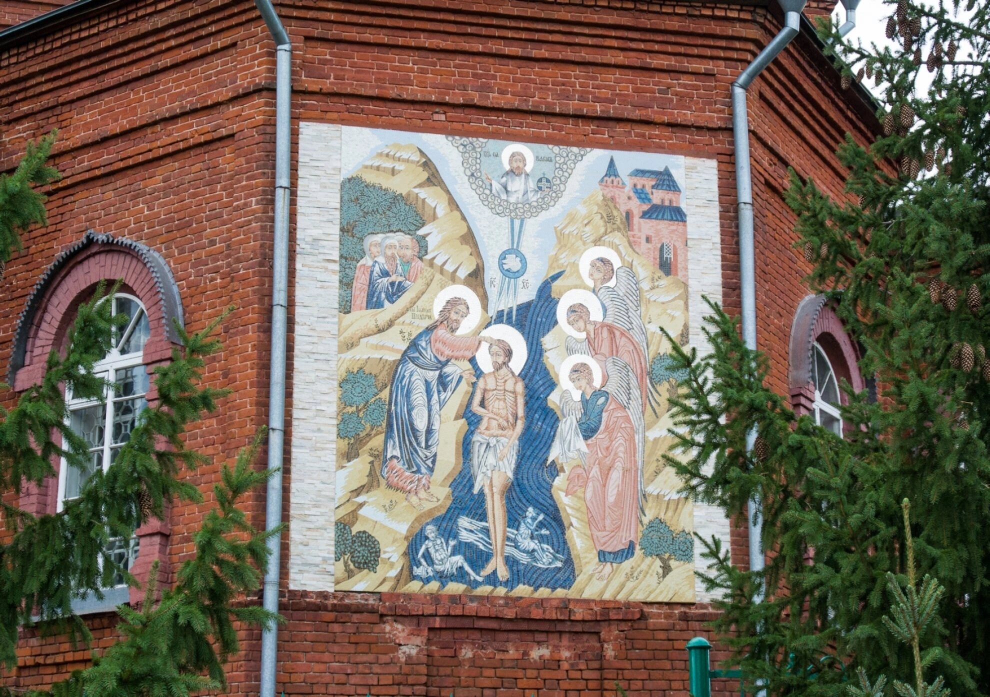 Храм Богоявления Господня в посёлке Курумоч Самарской области представляет собой значительный памятник православной культуры. На представленной фотографии запечатлено уникальное мозаичное панно, украшающее фасад храма и изображающее ключевое евангельское событие — Крещение Господне в водах реки Иордан.
