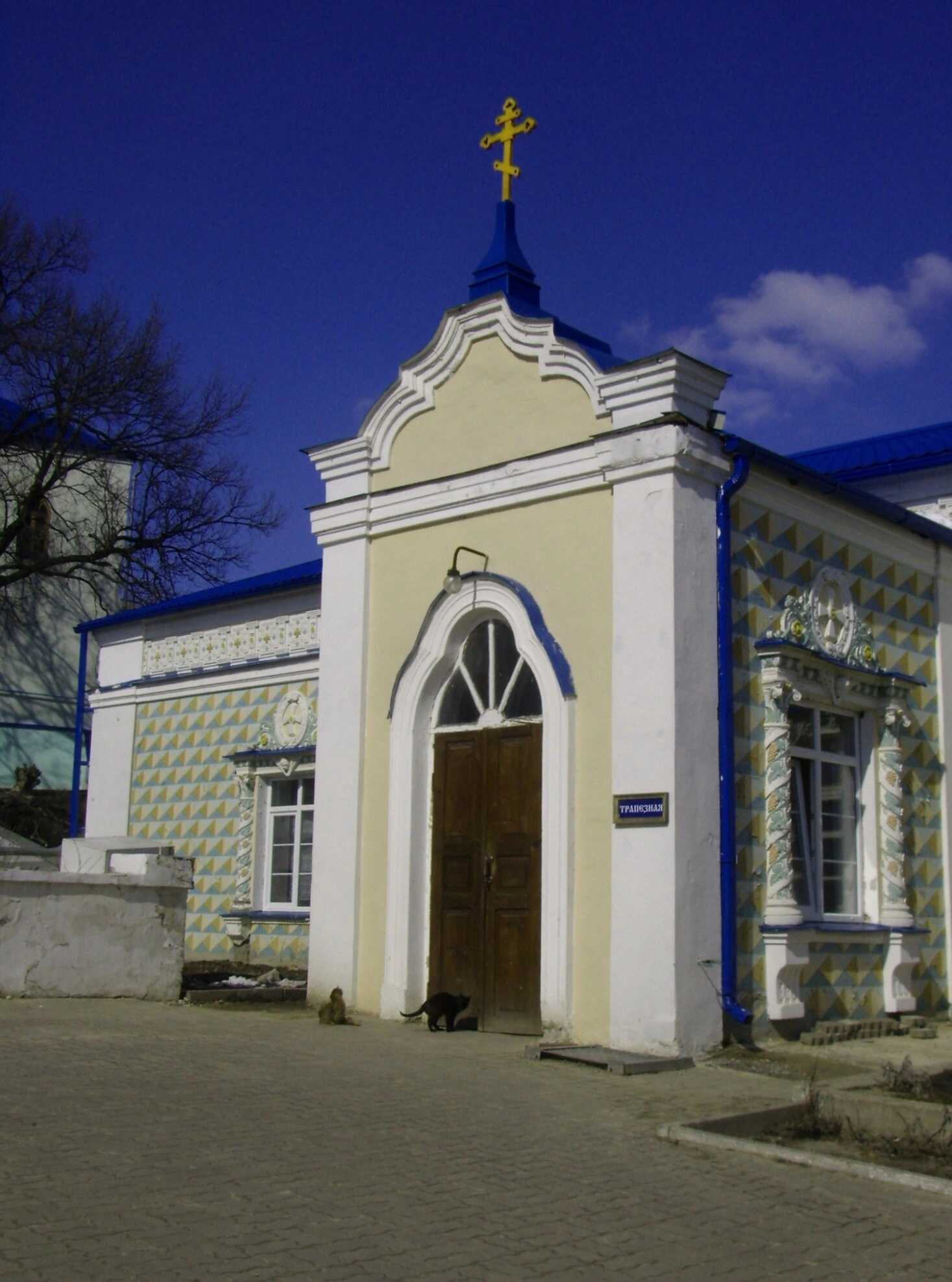 На представленной фотографии запечатлено одно из зданий мужского монастыря во имя Рождества Пресвятой Богородицы Коренная пустынь, расположенного в местечке Свобода Золотухинского района Курской области. Снимок демонстрирует трапезную церковь обители, о чём свидетельствует сохранившаяся надпись «ТРАПЕЗНАЯ» на фасаде.