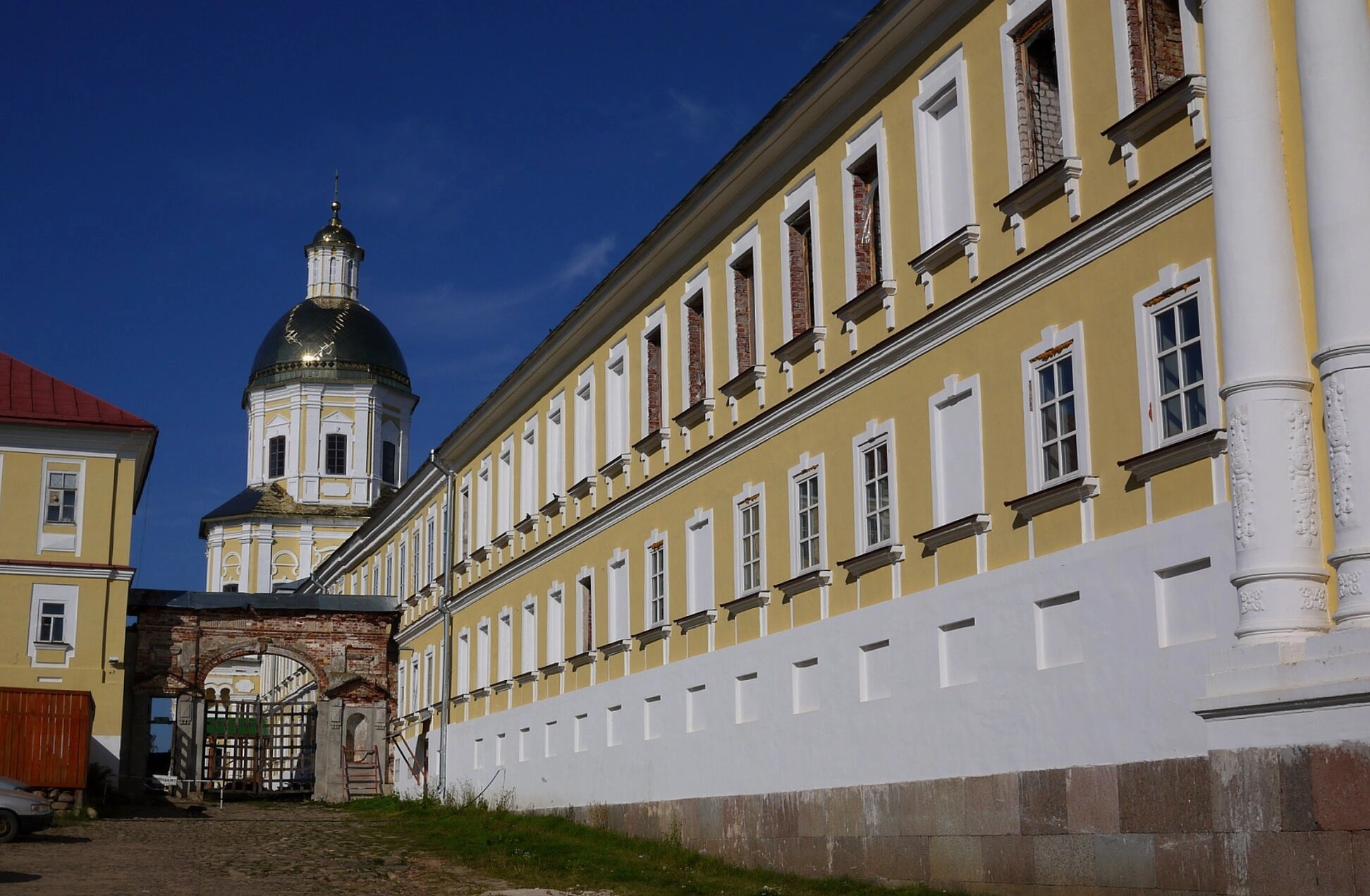 На переднем плане фотографии можно наблюдать один из братских корпусов или здание гостиницы для паломников, выполненные в стиле классицизма. Спокойная симметрия фасадов, сдержанный декор и гармоничные пропорции зданий свидетельствуют о высоком мастерстве русских зодчих. Монастырь, переживший годы запустения в советский период, ныне полностью восстановлен и является действующей мужской обителью, привлекающей тысячи паломников и туристов своим духовным величием и необыкновенной красотой.