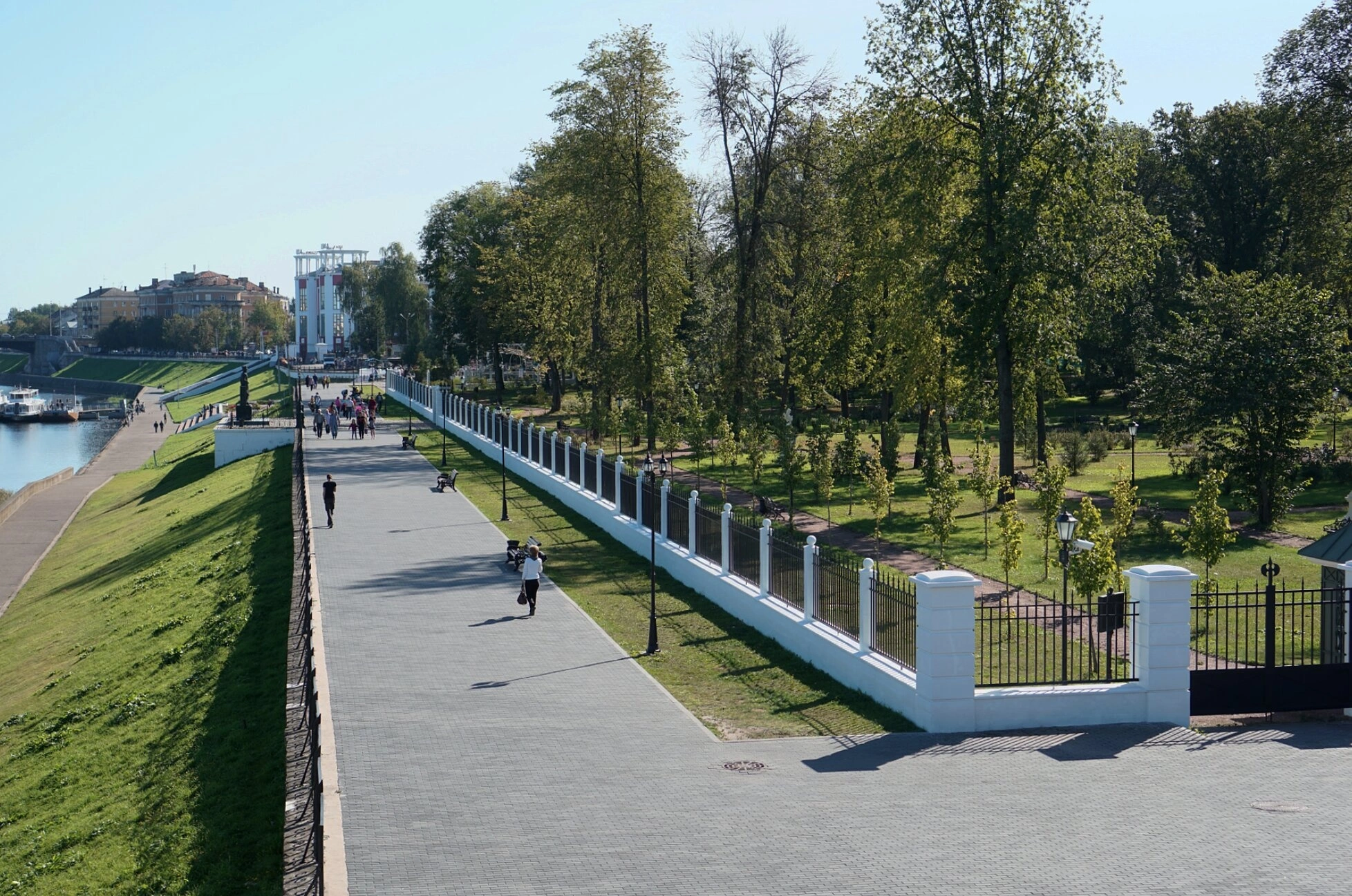 За оградой открывается вид на ухоженный парковый массив с зелёными газонами и взрослыми деревьями. На заднем плане фотографии виднеются фасады жилых домов и городские постройки, характерные для архитектуры Твери. Общий вид передаёт спокойную и умиротворённую атмосферу этого популярного места для прогулок с живописной панорамой на великую русскую реку Волгу.