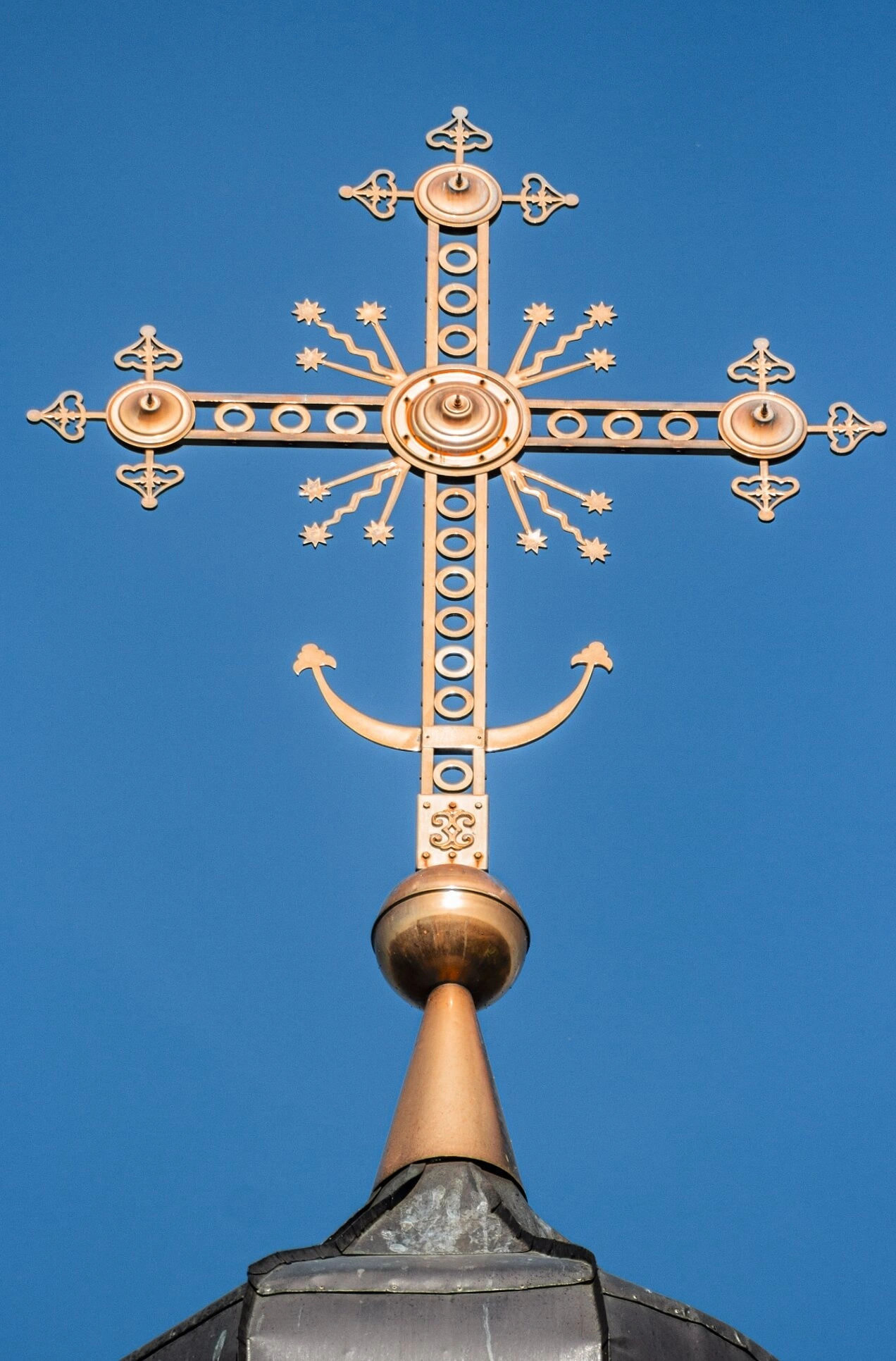 Крест, выполненный в традициях русского церковного зодчества, имеет сложную и богатую орнаментацию. От его центральной части расходятся декоративные лучи, символизирующие сияние благодати Божией. В основании креста традиционно расположен полумесяц (цата), что является древним христианским символом, обозначающим якорь надежды и победу Христа над язычеством.