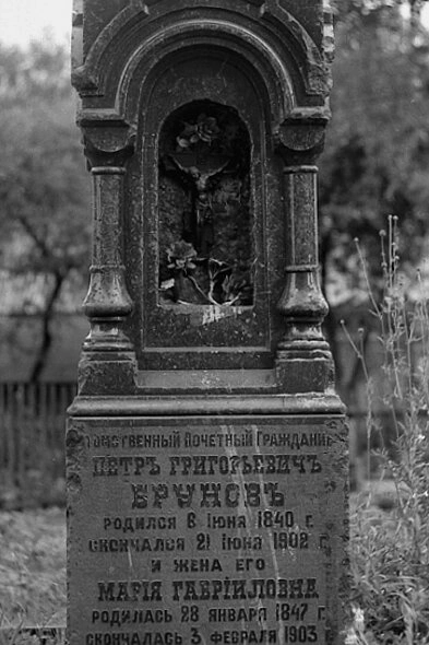 На лицевой стороне памятника сохранилась историческая эпитафия, выполненная в дореволюционной орфографии. Согласно надписи, здесь покоятся останки потомственного почётного гражданина Петра Григорьевича Брунова, родившегося 6 июня 1840 года и отошедшего ко Господу 2 июня 1902 года, а также его супруги Марии Гаврииловны Бруновой, родившейся 28 января 1847 года и преставившейся 3 февраля 1903 года.