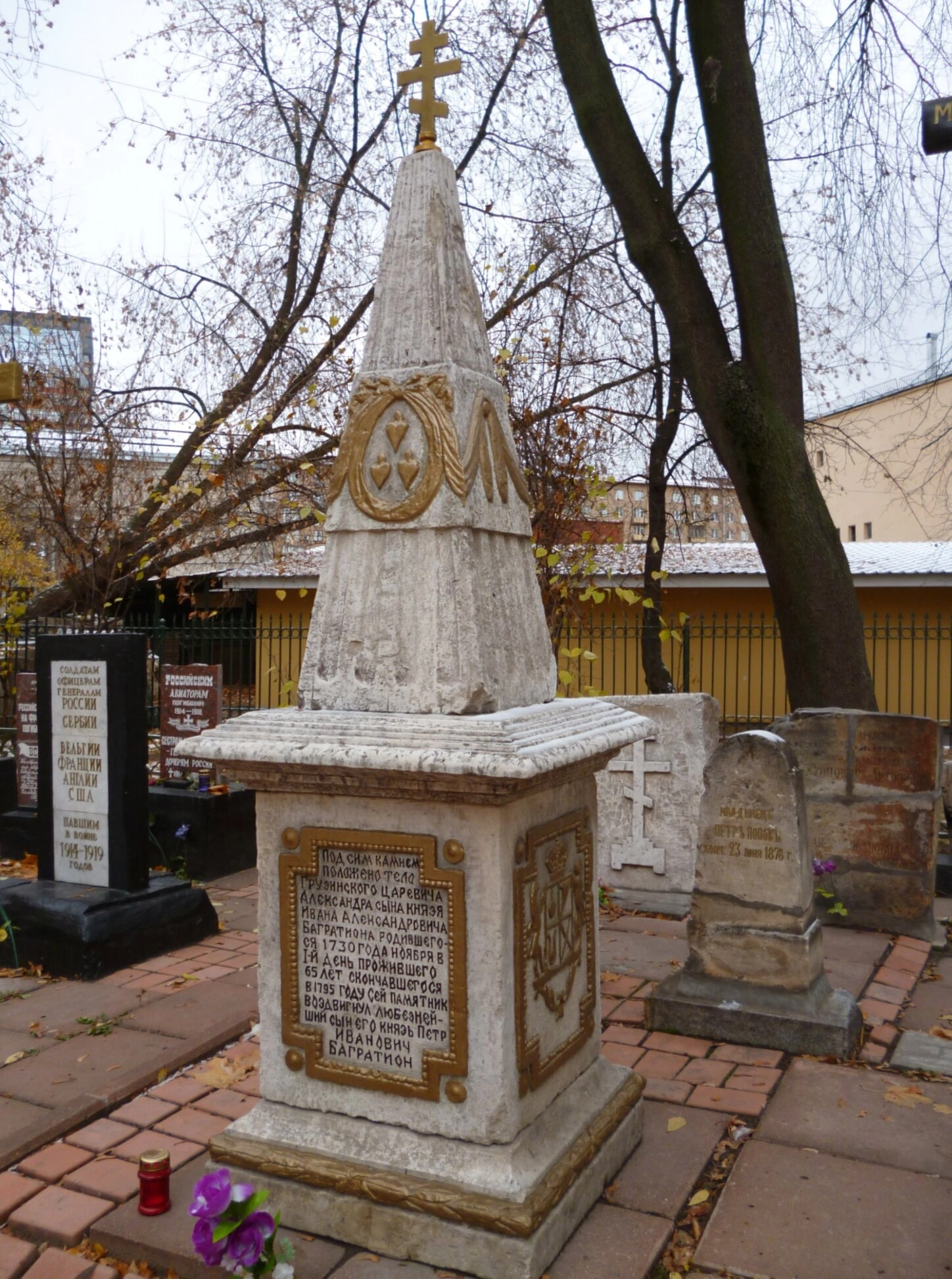 На представленной фотографии запечатлён исторический Грузинский некрополь, расположенный на территории храма Всех Святых во Всехсвятском в московском районе Сокол. В центре композиции находится белокаменное надгробие, выполненное в форме усечённой пирамиды, увенчанной православным крестом. Этот памятник установлен над местом упокоения грузинского царевича Александра, сына князя Ивана Александровича Багратиона.