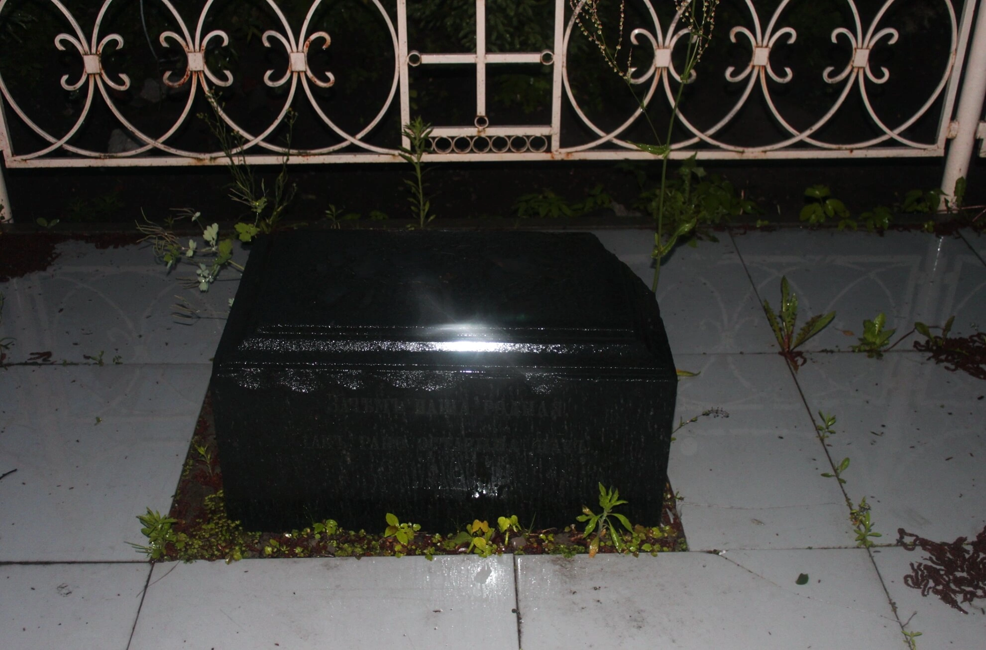 На представленной фотографии запечатлён один из исторических артефактов на территории Свято-Лаврентьева мужского монастыря в городе Калуге. Чёрный каменный прямоугольный постамент, предположительно являющийся надгробием, установлен на каменной плитке. Его лаконичная и строгая форма соответствует традициям православного памятного зодчества. Объект находится под защитой белого металлического ограждения с декоративными коваными элементами, что подчёркивает его значимость и оберегает от возможных повреждений.