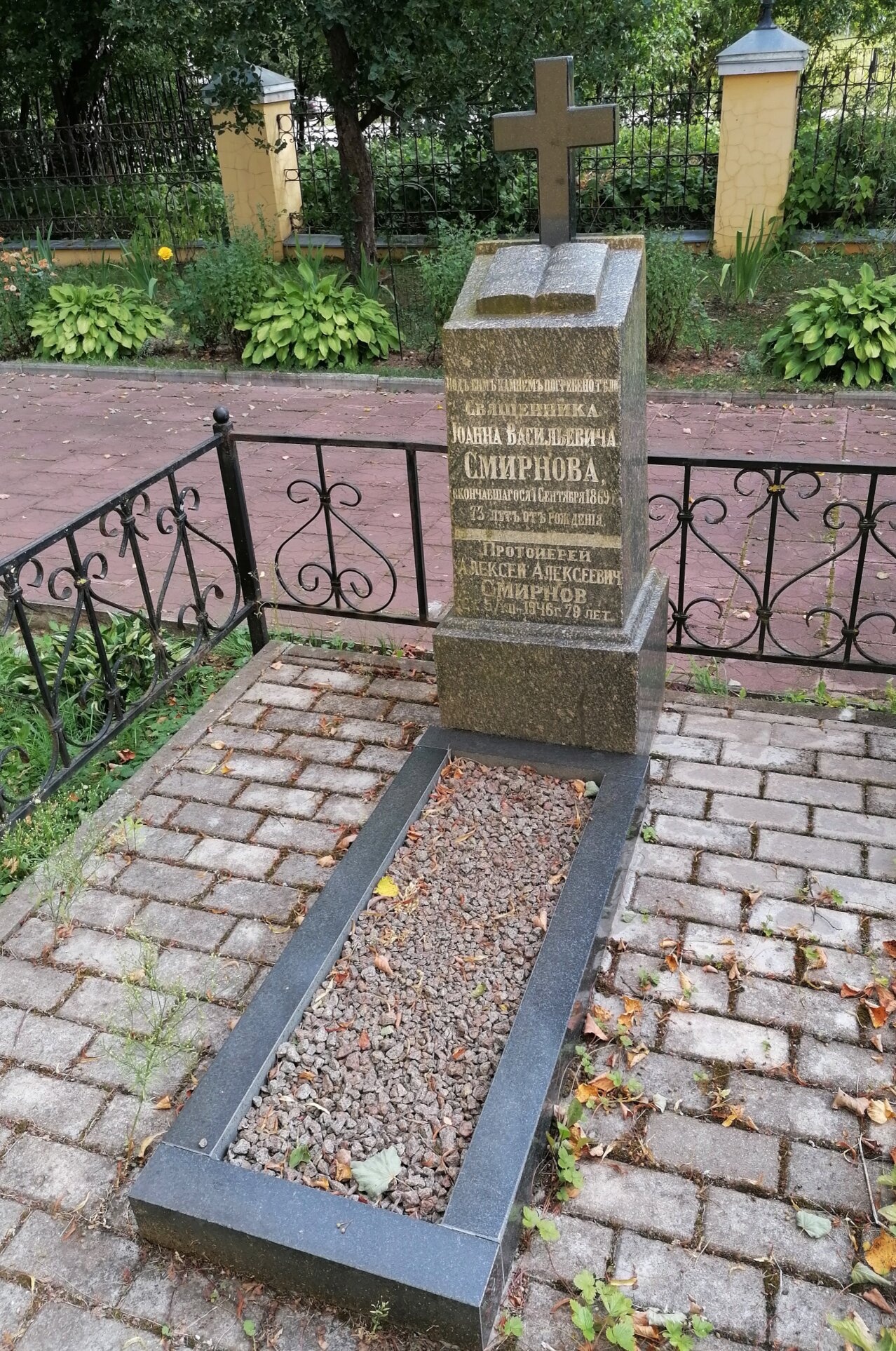 Центральным элементом памятника является крест, возвышающийся над каменной книгой. На поверхности надгробия выгравированы имена и саны упокоившихся: «СВЯЩЕННИКА ЈОАННА ВАСИЛЬЕВИЧА СМИРНОВА» и «ПРОТОИЕРЕЙ АЛЕКСЕЙ АЛЕКСЕЕВИЧ СМИРНОВ». Ограждение участка выполнено в виде низкого металлического забора с декоративными элементами, что подчёркивает особое почтение к месту упокоения. Территория вокруг вымощена тротуарной плиткой с гравийным покрытием в центральной части.